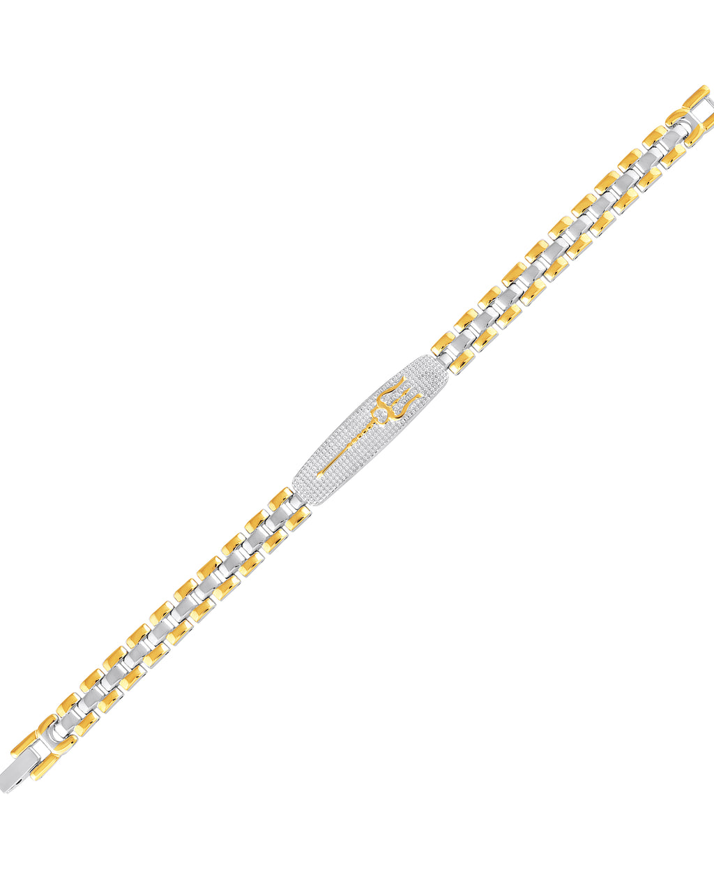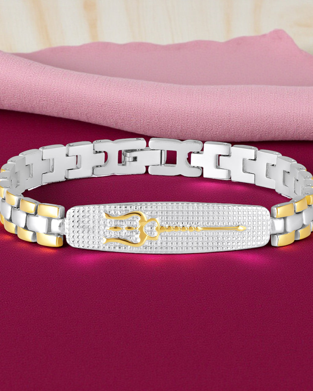 Add a royal touch to your style with this luxurious gold plated men’s bracelet. Crafted with precision and finished in a rich two tone, this bracelet features a lord shiva trishul textured center plate and sturdy chain links that offer both comfort and durability. Designed for the modern man, it complements both ethnic and western outfits, making it a perfect choice for parties, weddings, or daily wear. Its lustrous plating ensures long-lasting shine, while the secure clasp keeps it comfortably in place all day.