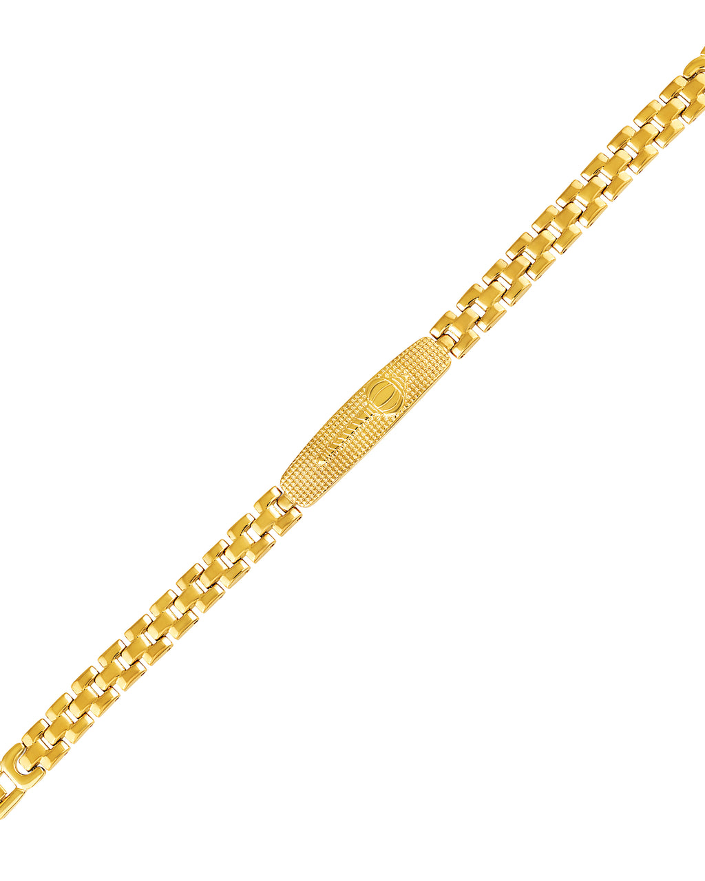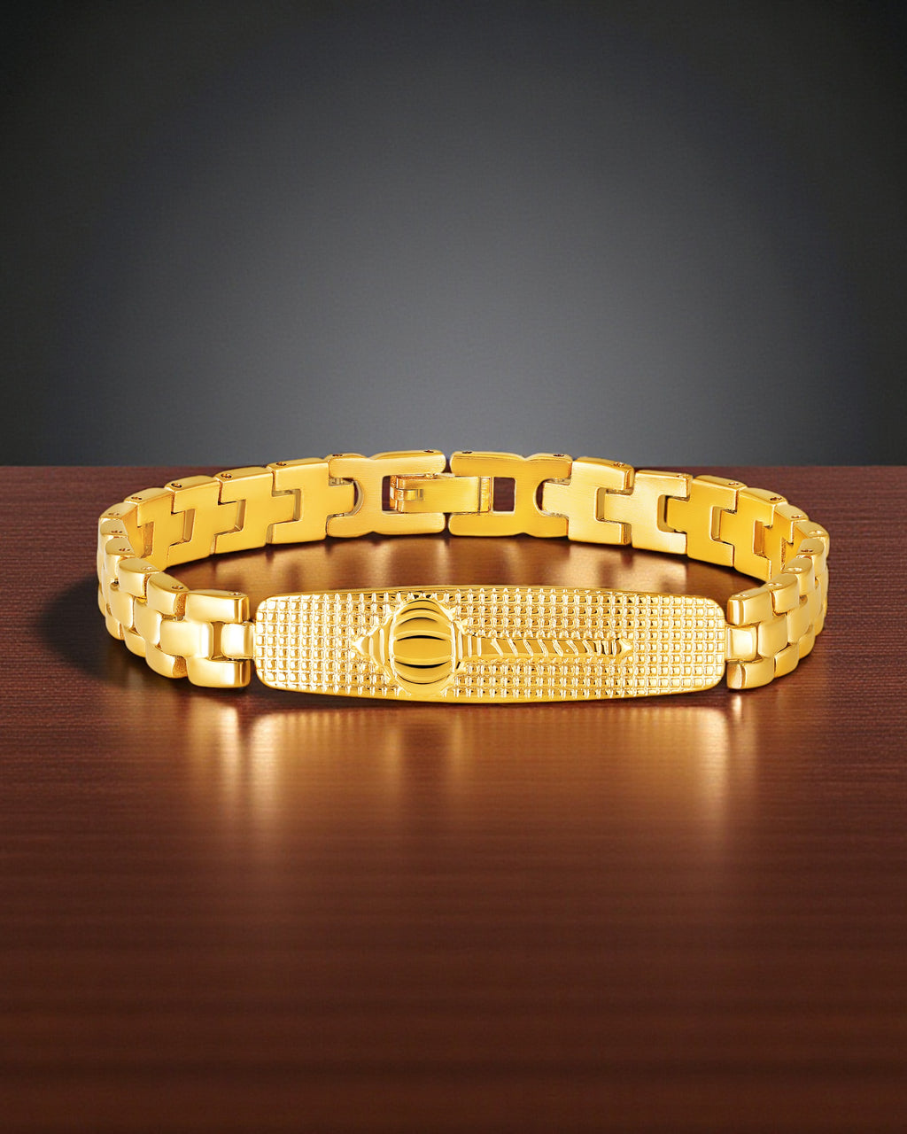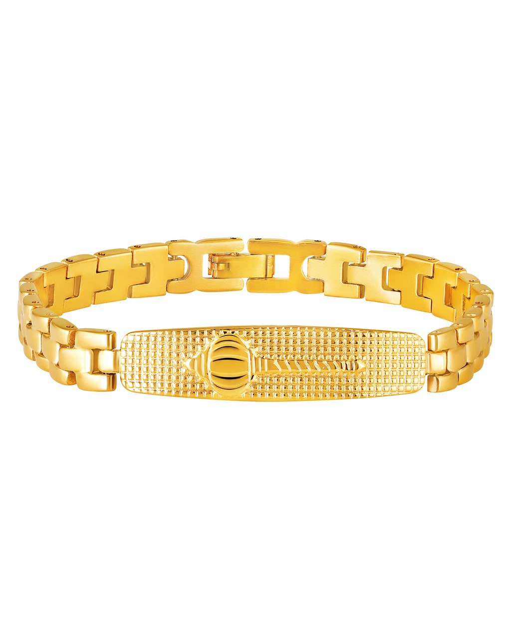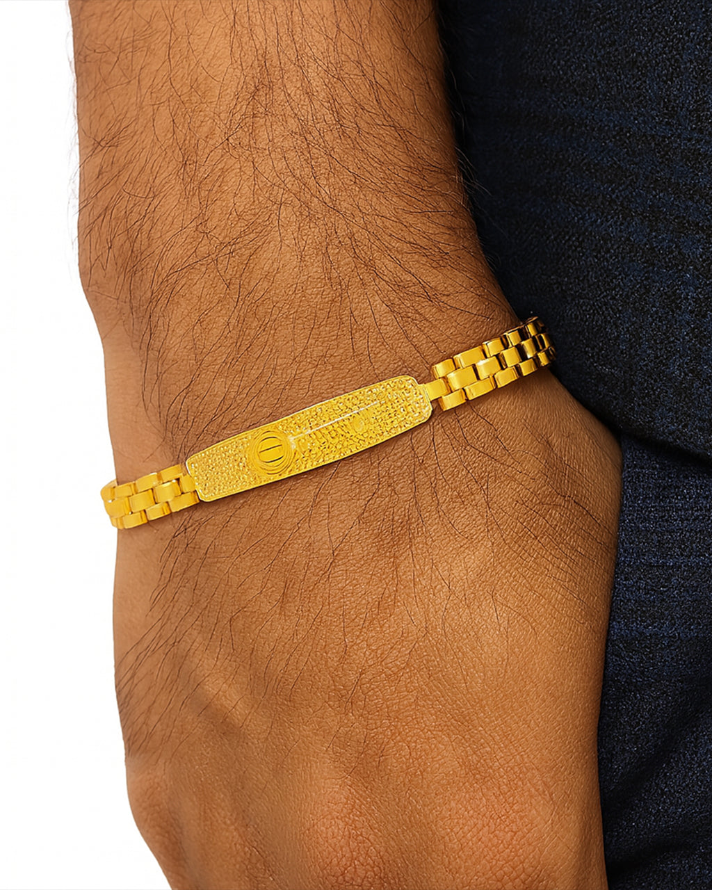 Add a royal touch to your style with this luxurious gold plated men’s bracelet. Crafted with precision and finished in a rich yellow-gold tone, this bracelet features a gada textured center plate and sturdy chain links that offer both comfort and durability. Designed for the modern man, it complements both ethnic and western outfits, making it a perfect choice for parties, weddings, or daily wear. Its lustrous plating ensures long-lasting shine, while the secure clasp keeps it comfortably in place all day.