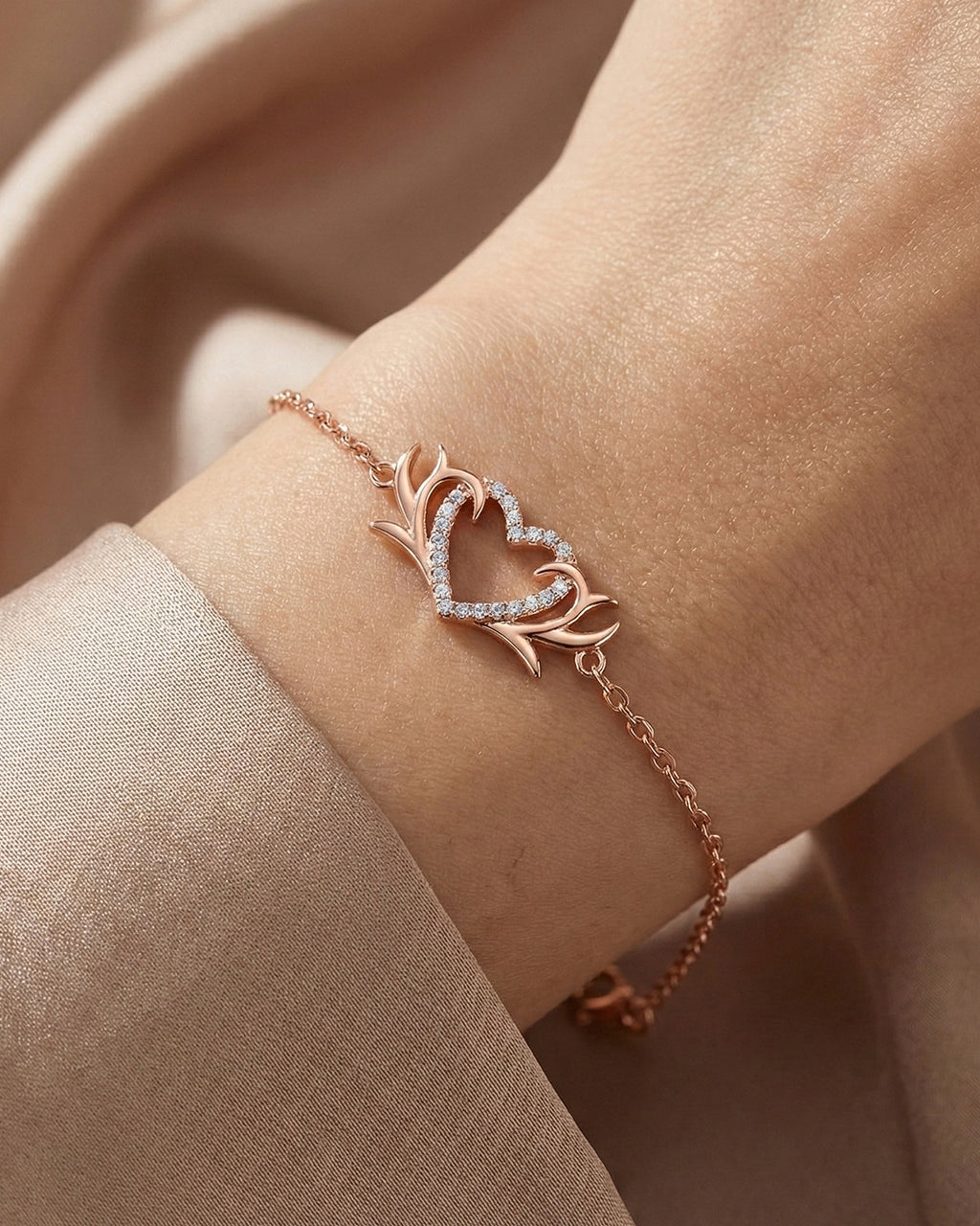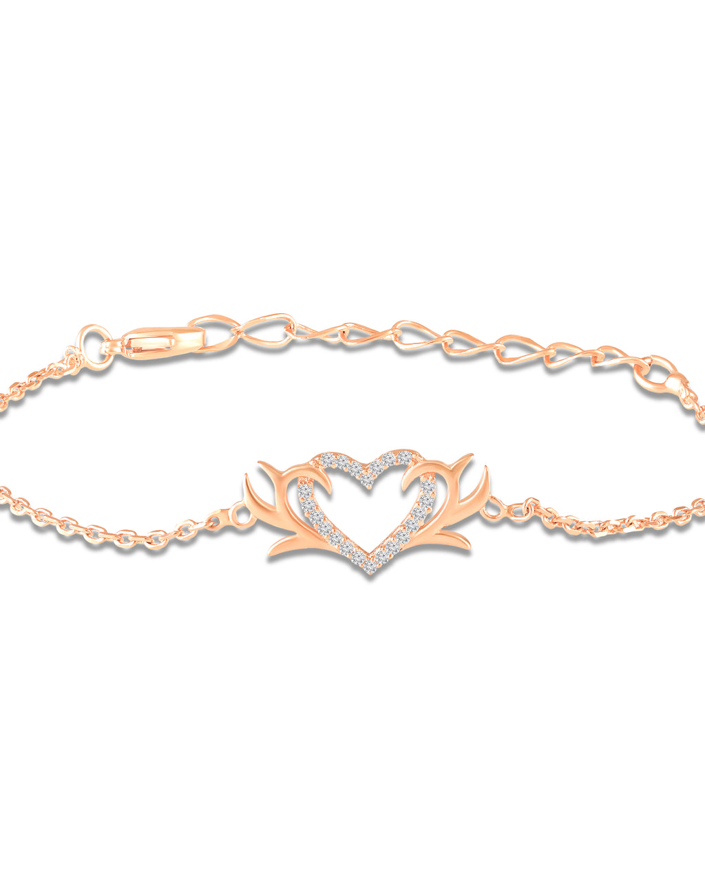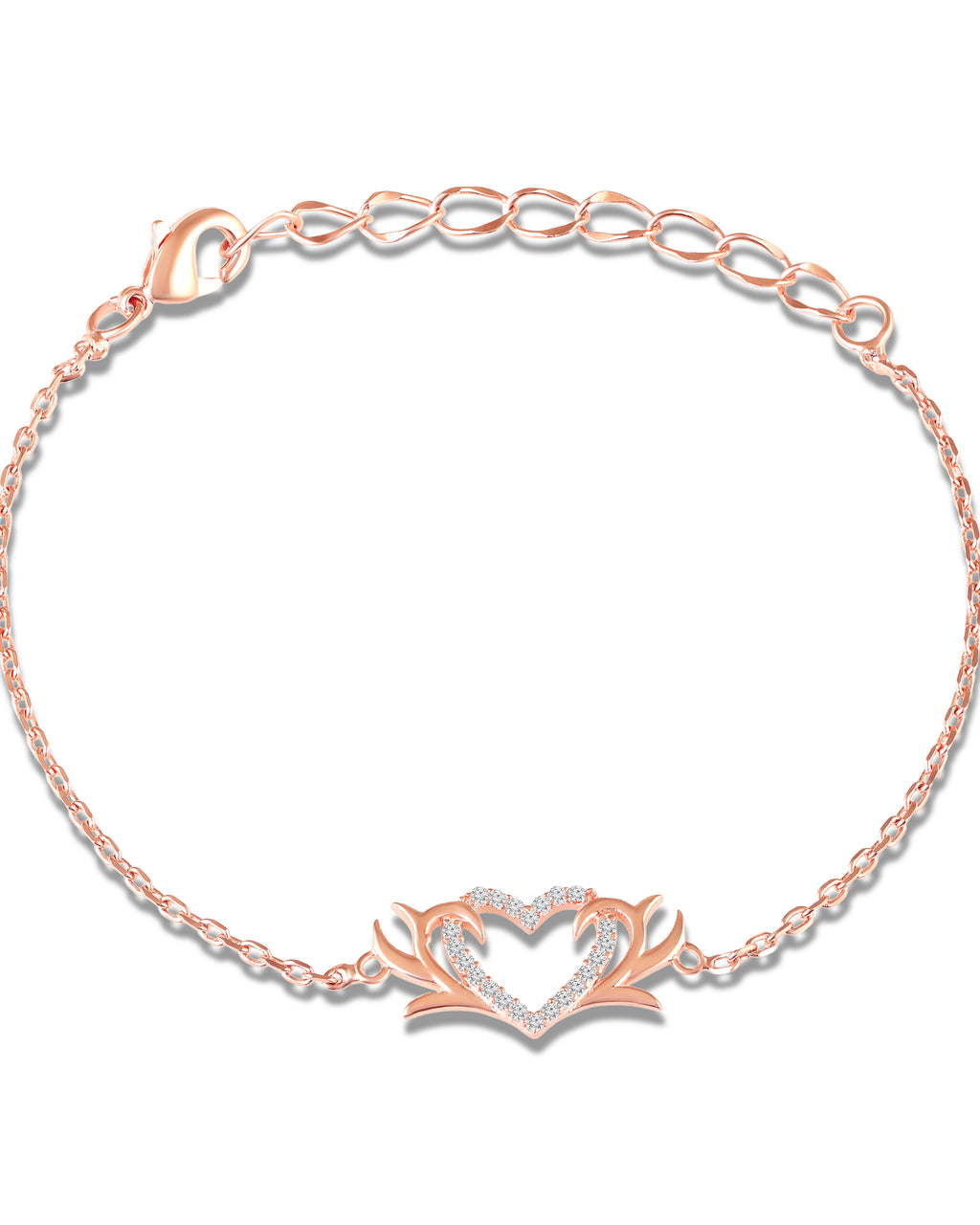 Add a romantic sparkle to your everyday style with this Mahi heart bracelet in a warm rose gold finish. The center features a graceful open-heart design highlighted with shimmering crystals stones, framed by elegant flourish accents for a classy, feminine look. Finished with an adjustable extender chain and secure lobster clasp, it’s perfect for daily wear, date nights, and gifting.