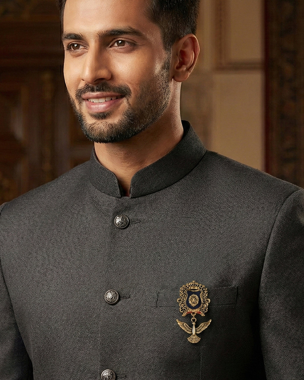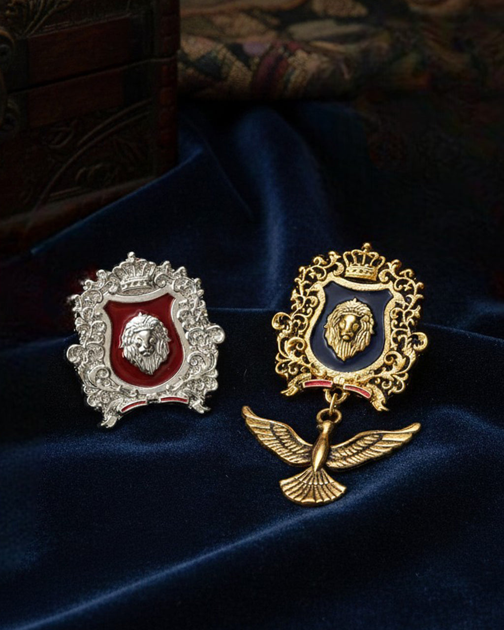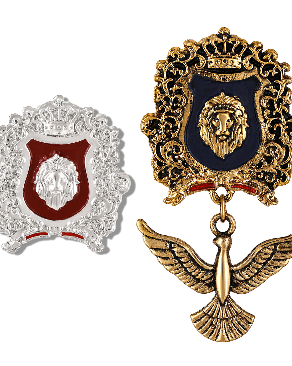 Make a bold, aristocratic style statement with this royal crest-inspired lapel pin Broach. Designed with an ornate crowned shield, a powerful lion emblem, and a striking dangle bird charm, it adds instant character to blazers, suits, coats, bandhgalas, sherwanis, and even dresses. The detailed frame, glossy enamel look, and vintage-inspired finish create a premium, standout accessory for formal events, parties, weddings, and gifting.