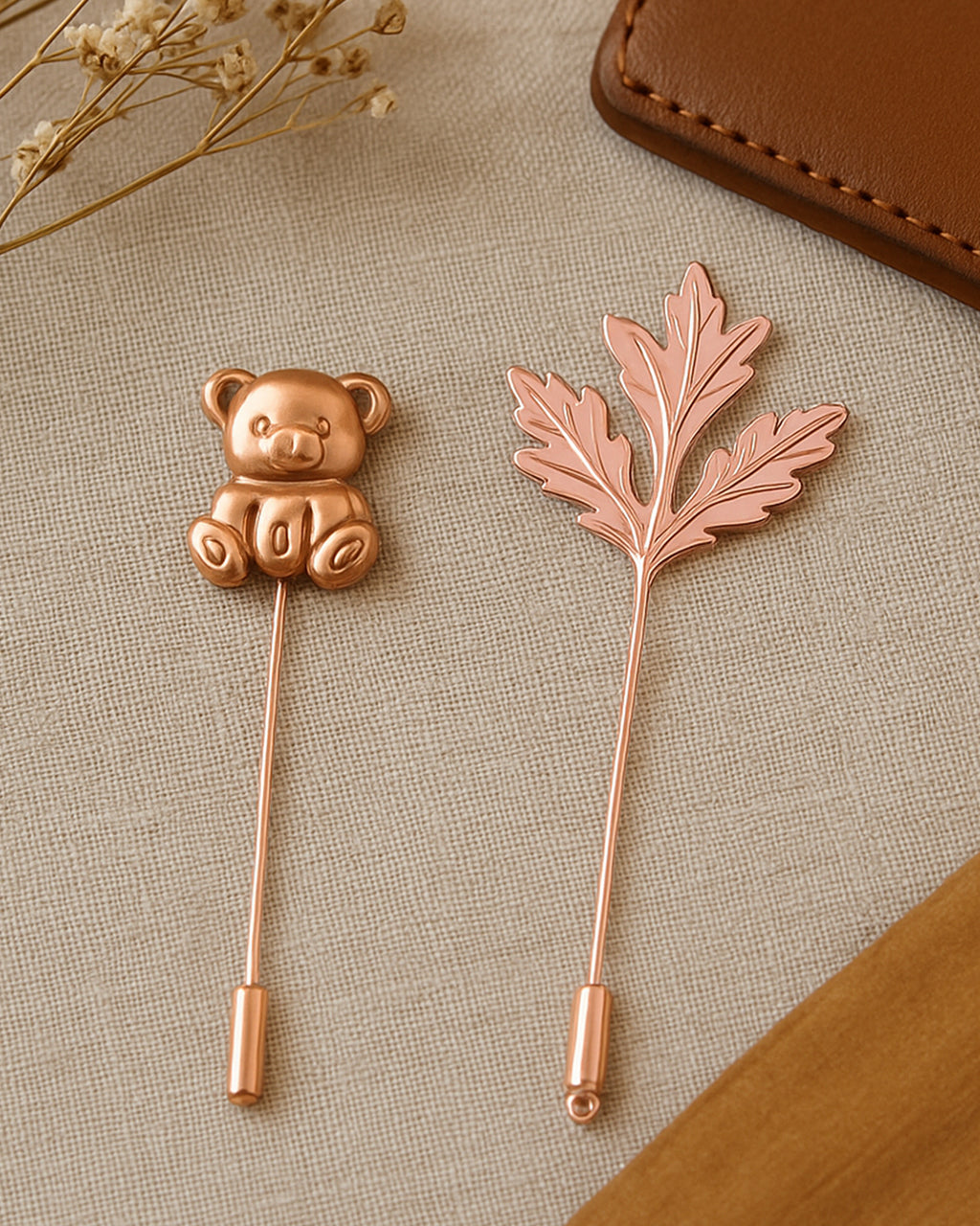 Add a refined statement to your blazer, suit, sherwani, coat, or dress with this Mahi stick pin lapel Broach set featuring two modern motifs—a cute teddy bear and a minimal leaf—finished in a classy rose-gold tone. The sleek long-pin design sits neatly on lapels, collars, scarves, hats, and handbags, making it ideal for both everyday styling and special occasions like weddings, parties, office events, and gifting.