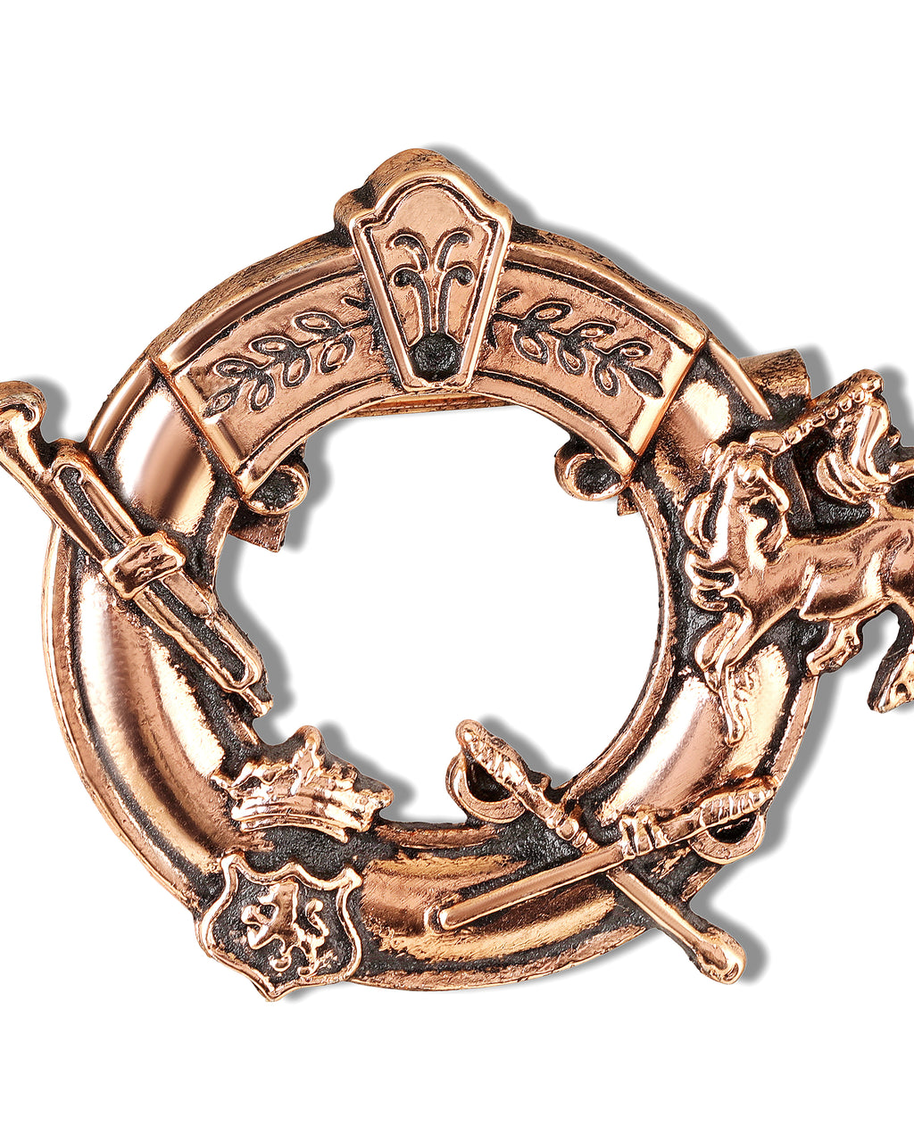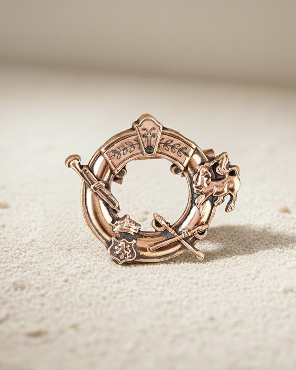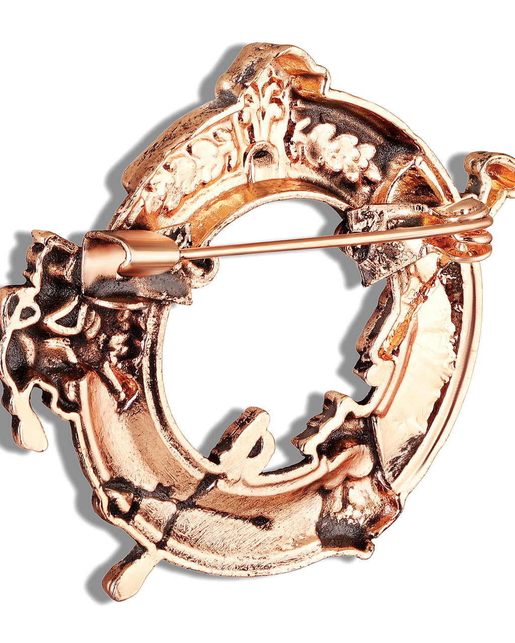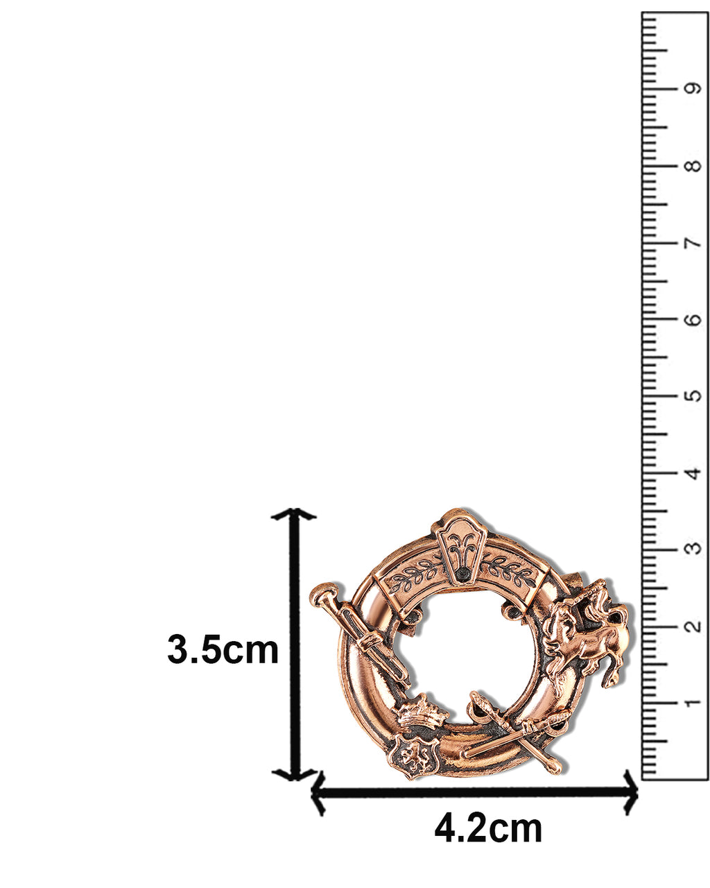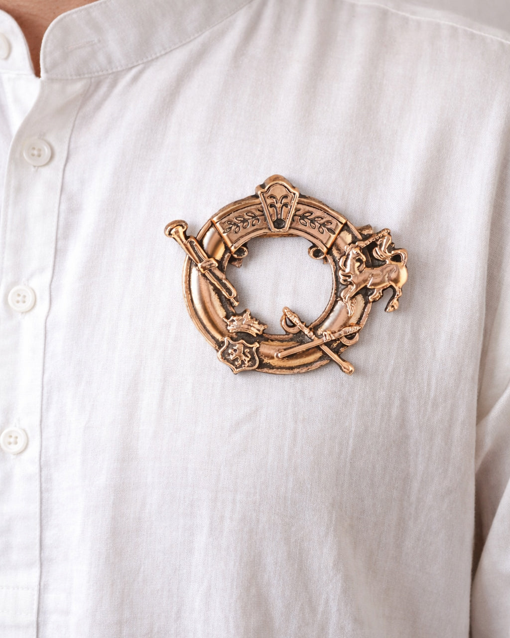 - Regal Emblem Design: Circular ring brooch with heritage motifs for a royal, statement look