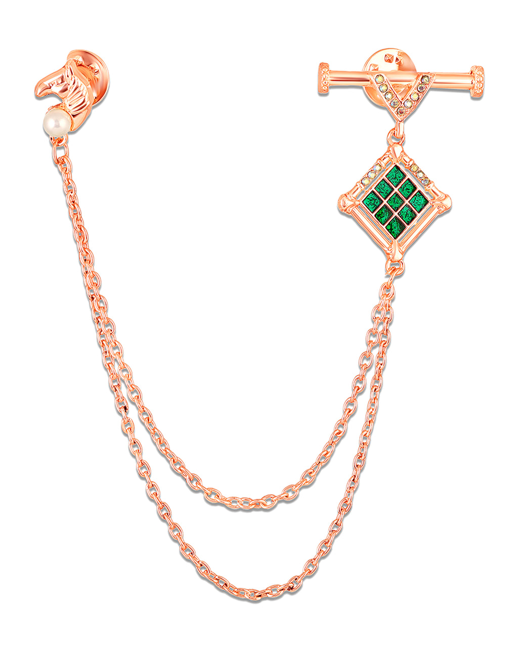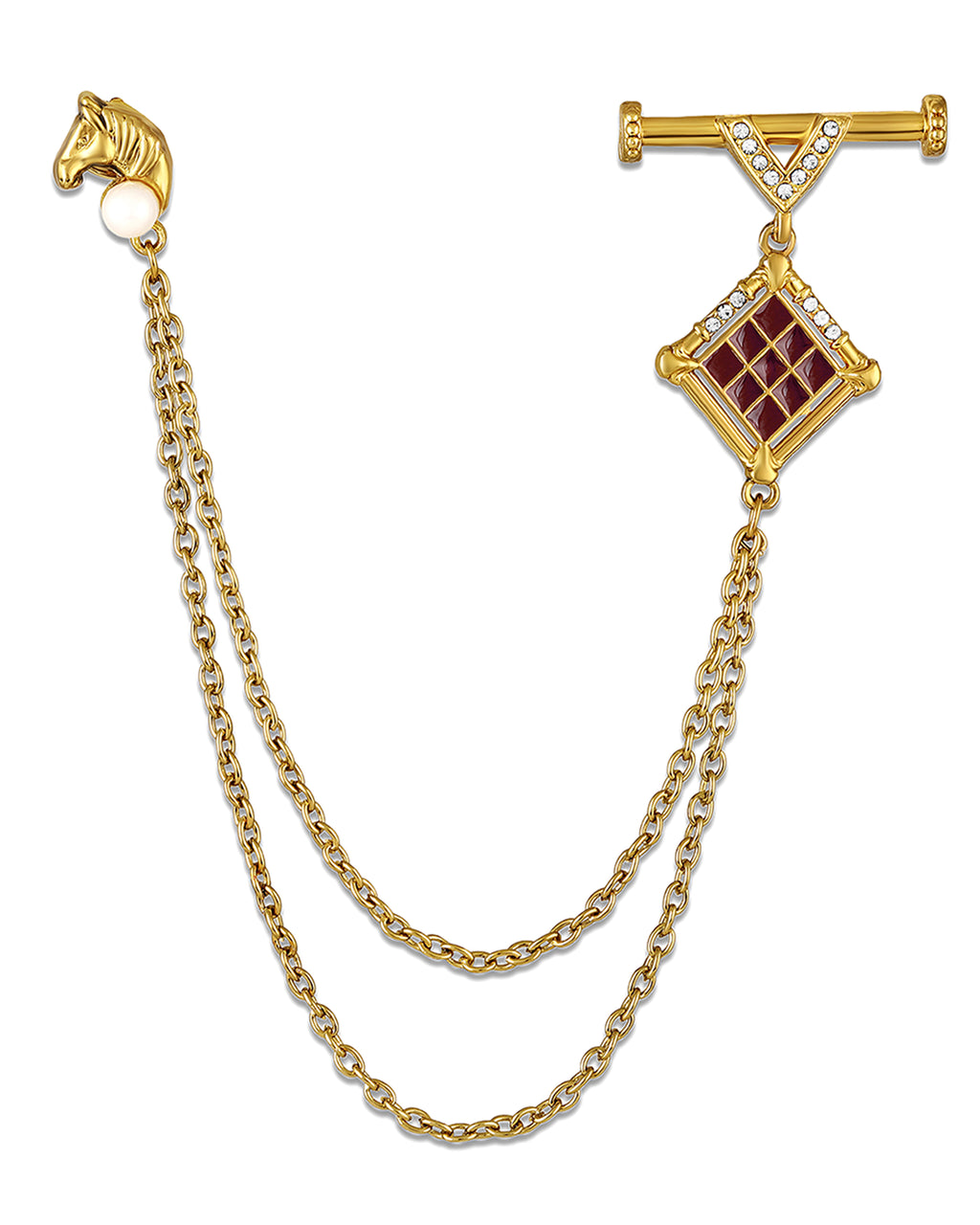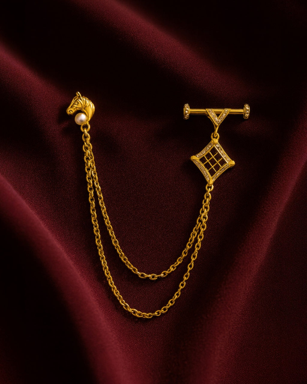 Add instant regal charm to your ethnic or formal look with this Mahi statement Broach. Designed with a sculpted horse-head-shaped end, a classic pearl-like bead detail, and a bold red enamel diamond centerpiece framed with sparkling crystal accents, this Broach features elegant double drape chains for a premium, layered finish. Perfect for sherwani, bandhgala, blazers, suits, kurtas, and wedding occasion styling.
