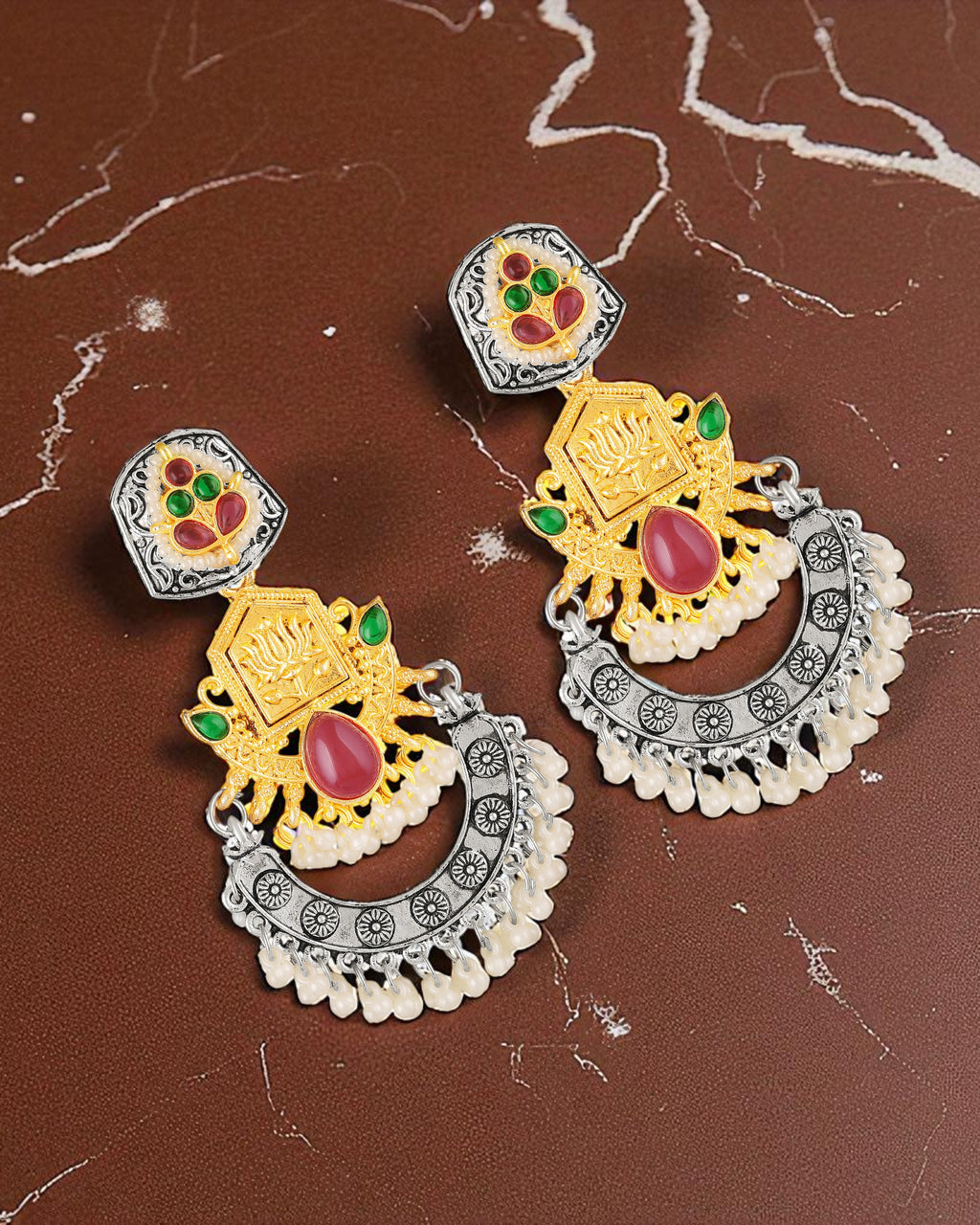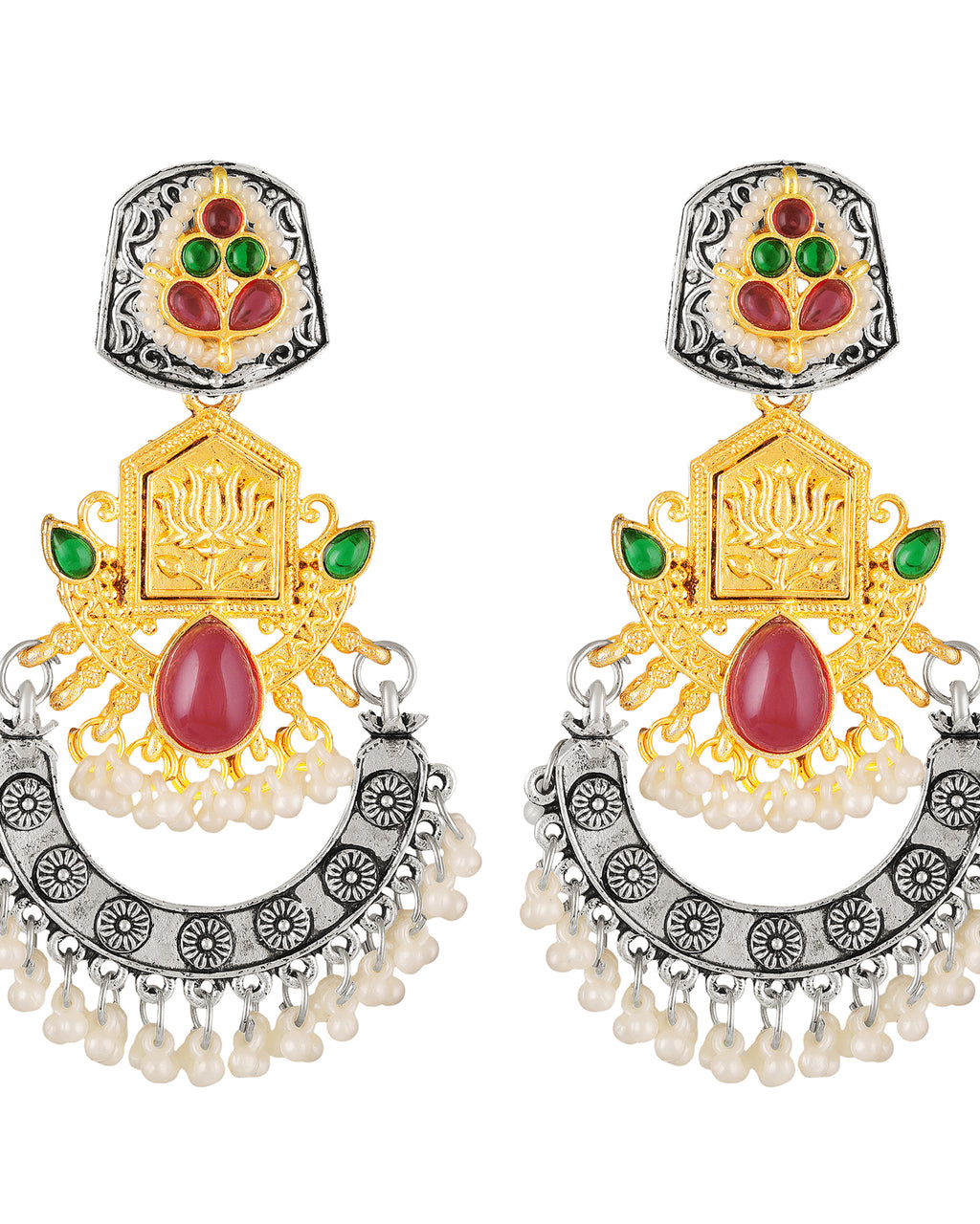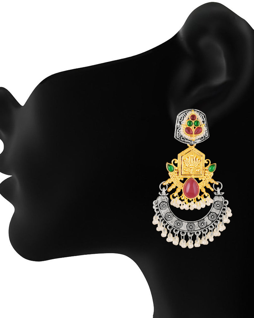 Add a regal touch to your ethnic ensemble with these beautifully crafted dual-tone dangler jhumka earrings. Featuring intricate silver-toned carvings, vibrant red and green enamel accents, gold-finish details, and delicate pearl bead drops, these earrings are a perfect blend of traditional artistry and modern elegance. Ideal for weddings, festive occasions, or cultural celebrations, these lightweight yet statement-making earrings will effortlessly elevate your style.