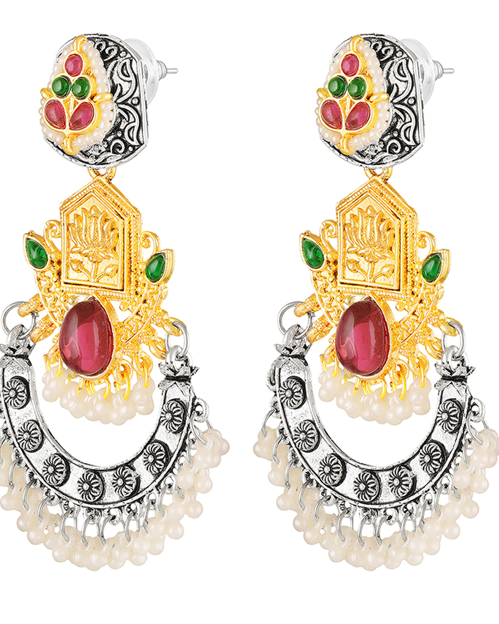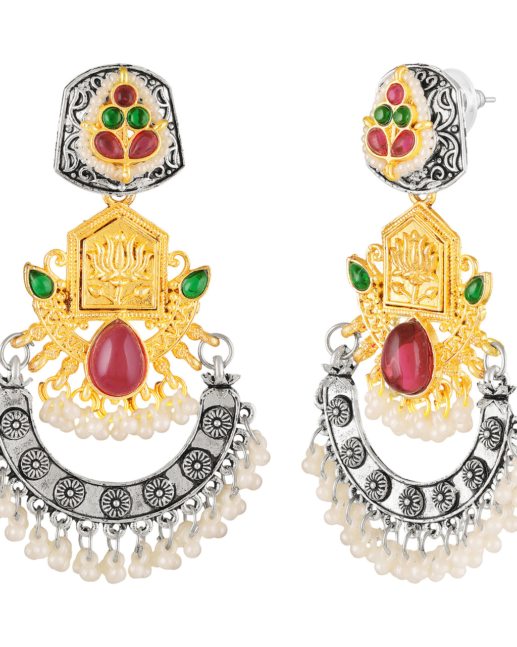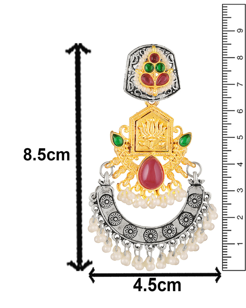 Add a regal touch to your ethnic ensemble with these beautifully crafted dual-tone dangler jhumka earrings. Featuring intricate silver-toned carvings, vibrant red and green enamel accents, gold-finish details, and delicate pearl bead drops, these earrings are a perfect blend of traditional artistry and modern elegance. Ideal for weddings, festive occasions, or cultural celebrations, these lightweight yet statement-making earrings will effortlessly elevate your style.