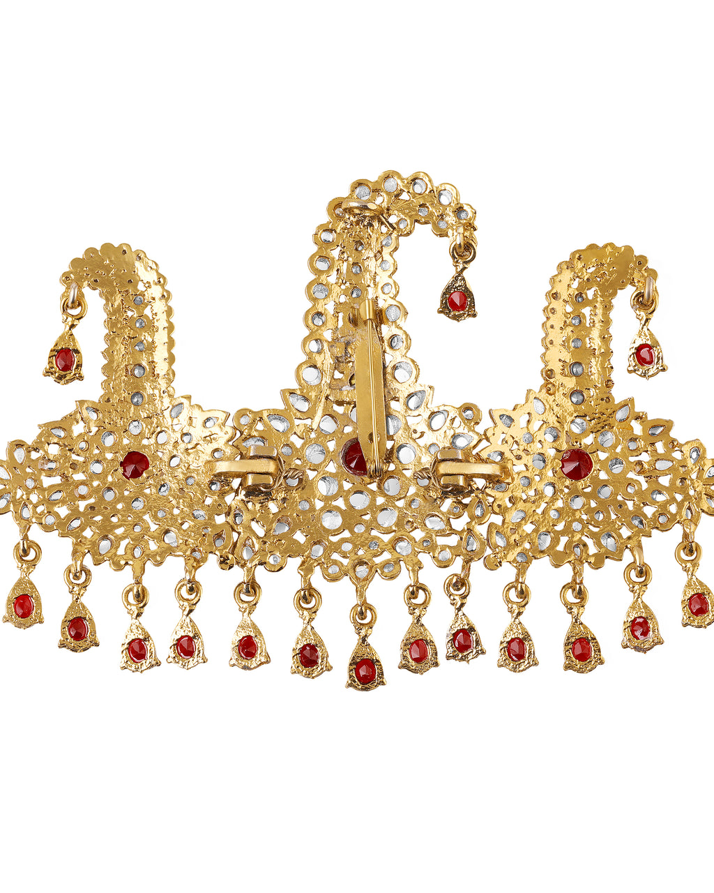 Enhance your regal wedding look with this Royal Red crystals Pearl Safa Kalangi for Groom, a masterpiece that radiates elegance and tradition. Handcrafted with precision, this Dulha Kalangi showcases a triple-crest design embellished with sparkling white crystals stones, red gemstones, and lustrous beads. The gold-plated base adds a touch of grandeur, making it a perfect match for sherwanis, bandhgalas, and traditional Indian attire. Whether you're the groom or part of the wedding party, this Pagdi Sarpech ensures you stand out with timeless royal flair.