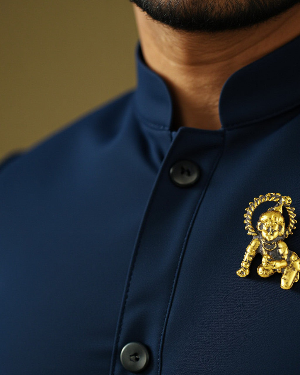 Celebrate your devotion with this Divine Baby Krishna Gold-Plated Brooch, beautifully designed to bring an auspicious touch to your attire. Crafted with precision and care, this brooch showcases Lord Krishna in his adorable Bal Gopal form, symbolizing love, innocence. This Krishna lapel pin is made from premium-quality alloy and features a lustrous gold finish that adds timeless elegance. Ideal for both men and women, it complements ethnic wear like kurta, saree, dupatta, sherwani, or even western wear such as blazers or scarves.