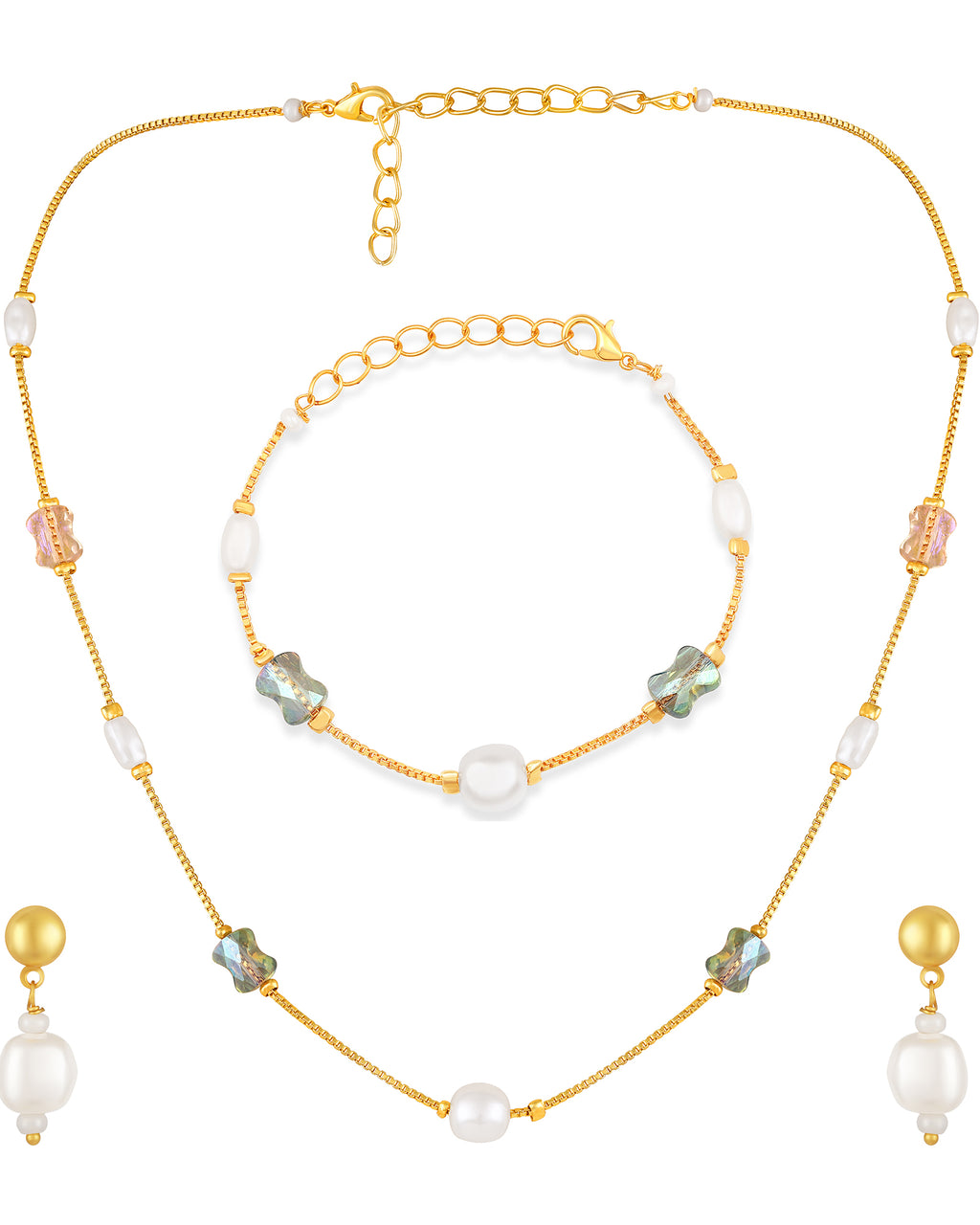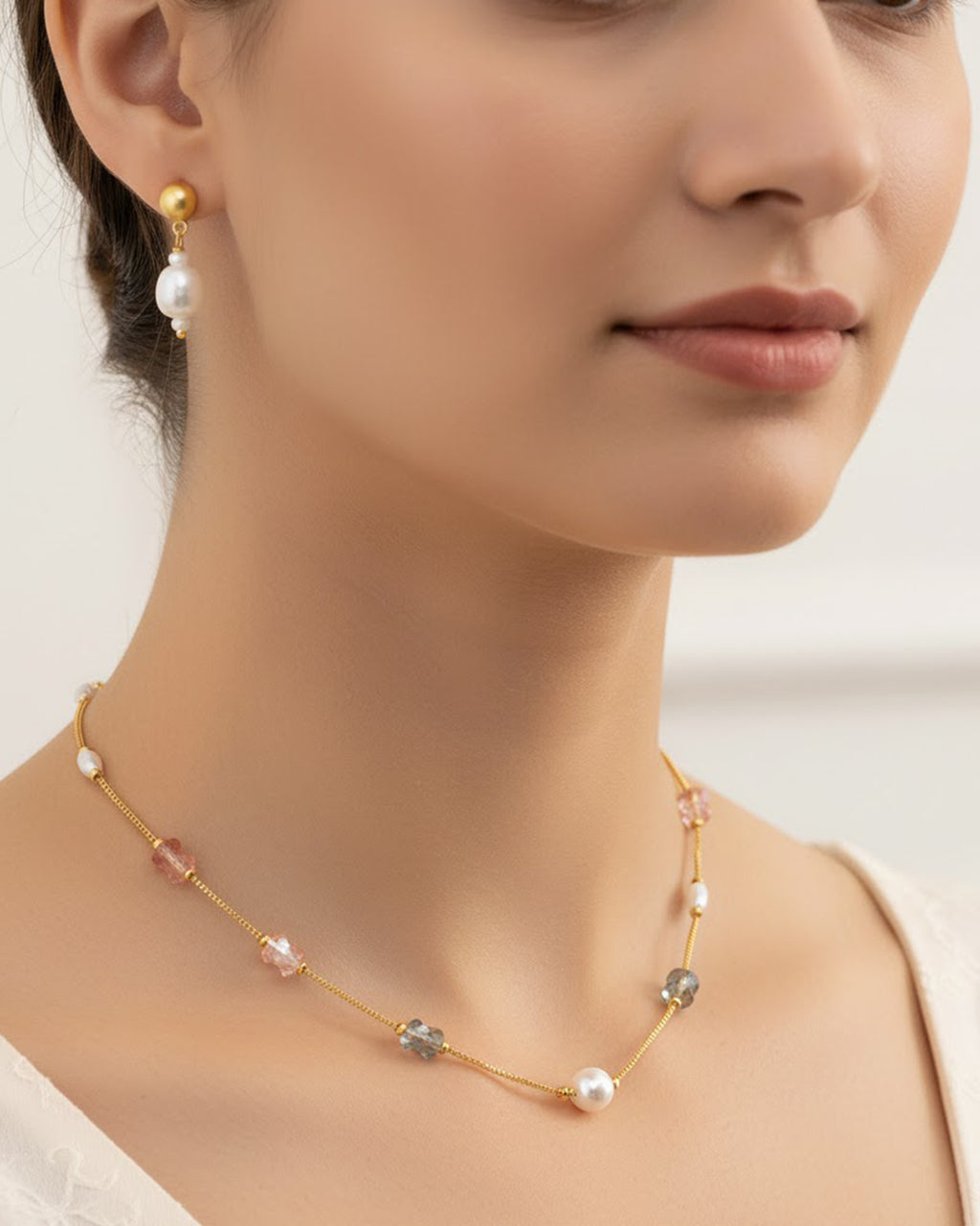 Elevate your style with this stunning gold-plated delicate necklace set featuring lustrous pearls and multicolor crystal beads. Designed with precision and elegance, this minimal yet eye-catching jewellery set is perfect for festive wear, parties, and daily elegance. The lightweight design ensures comfort all day, while the premium gold polish adds a touch of luxury. Pair it with ethnic or western outfits to create a graceful look that never goes out of style.