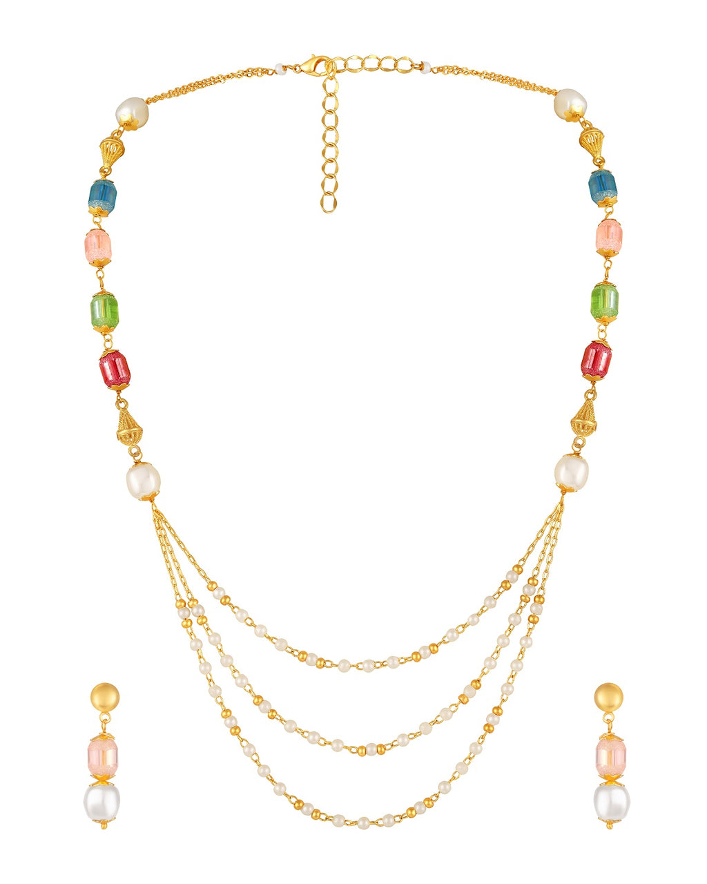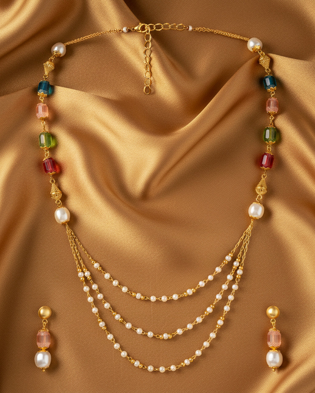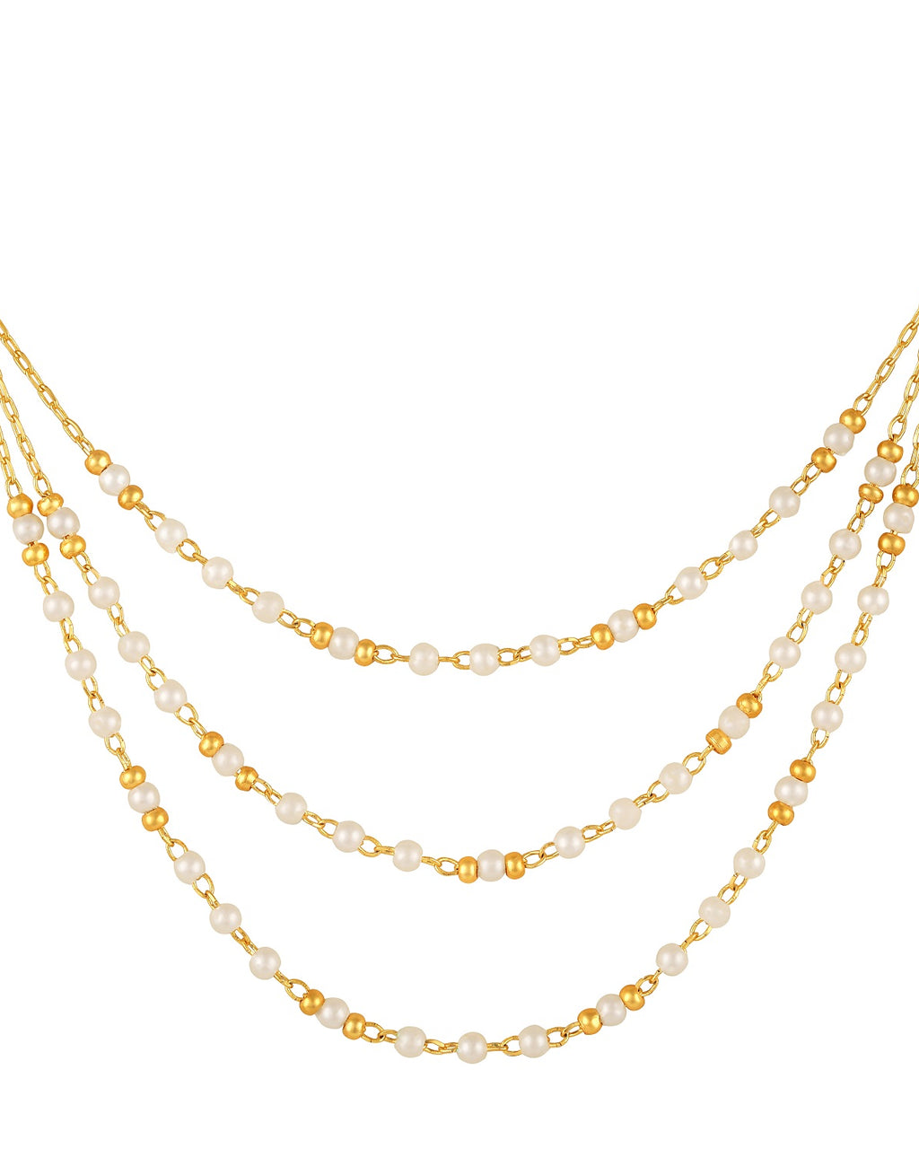 - Elegant Layered Design: Beautiful triple-layer gold-plated necklace with pearl and stone bead detailing adds a touch of sophistication to your ethnic or western outfits.