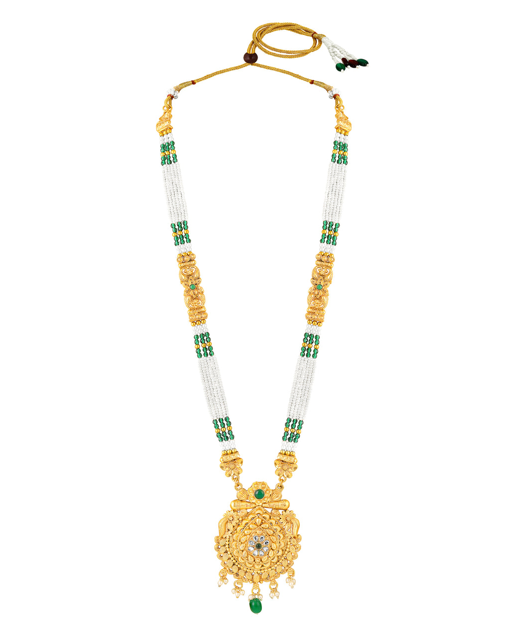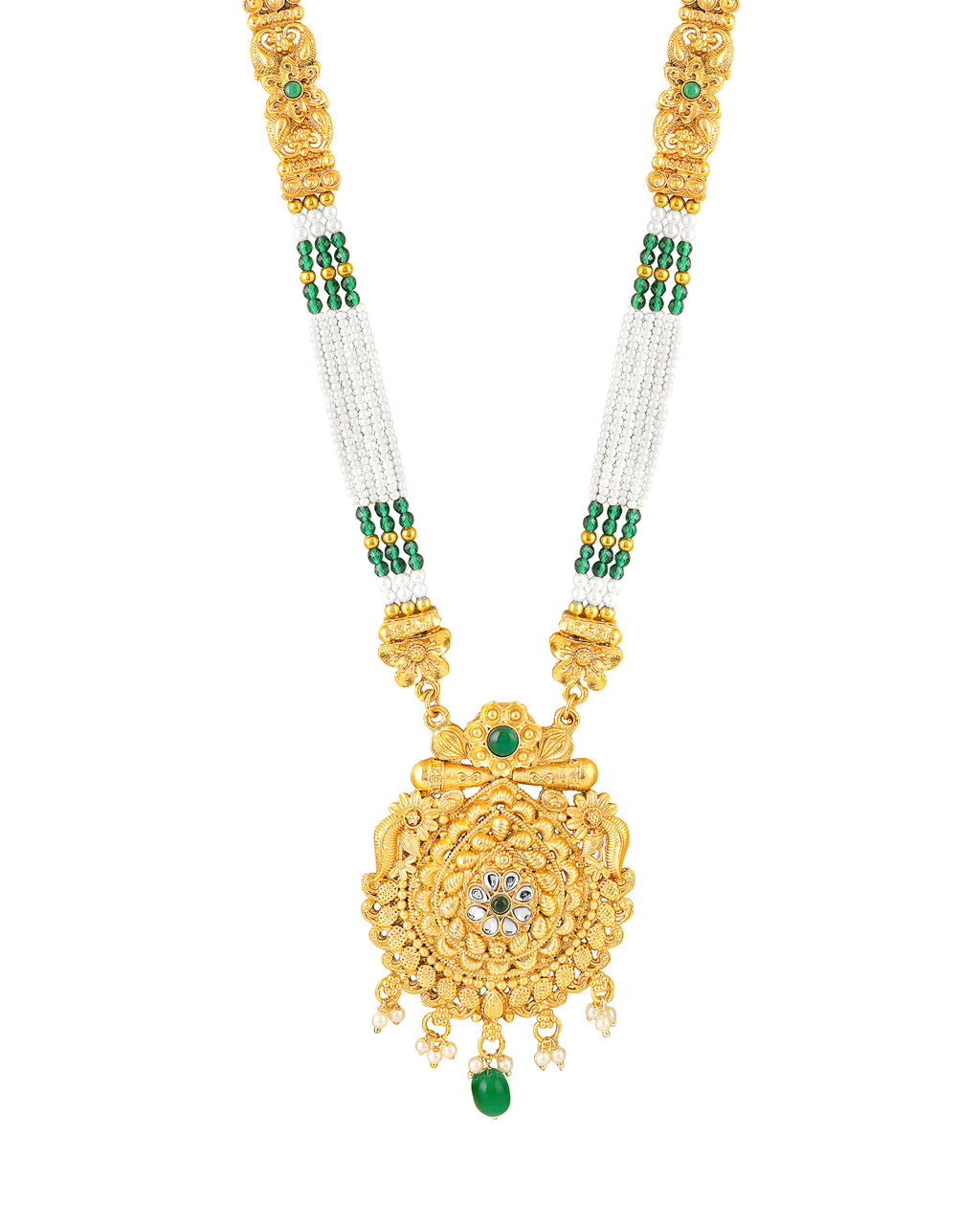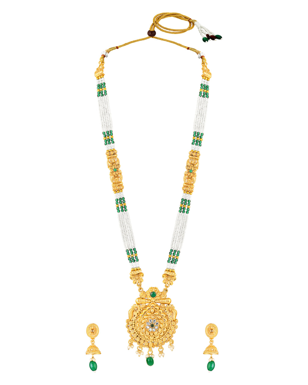 Add a touch of divine elegance to your ethnic look with this stunning Traditional Temple Jewellery Necklace Set. Crafted with intricate gold-plated detailing, the long haram design features multi-strand white and green beads with antique temple motifs, complemented by a grand circular pendant adorned with sparkling stones and green drops.