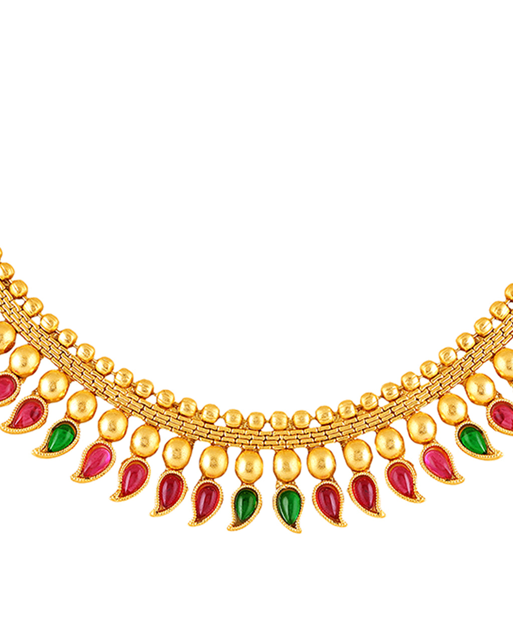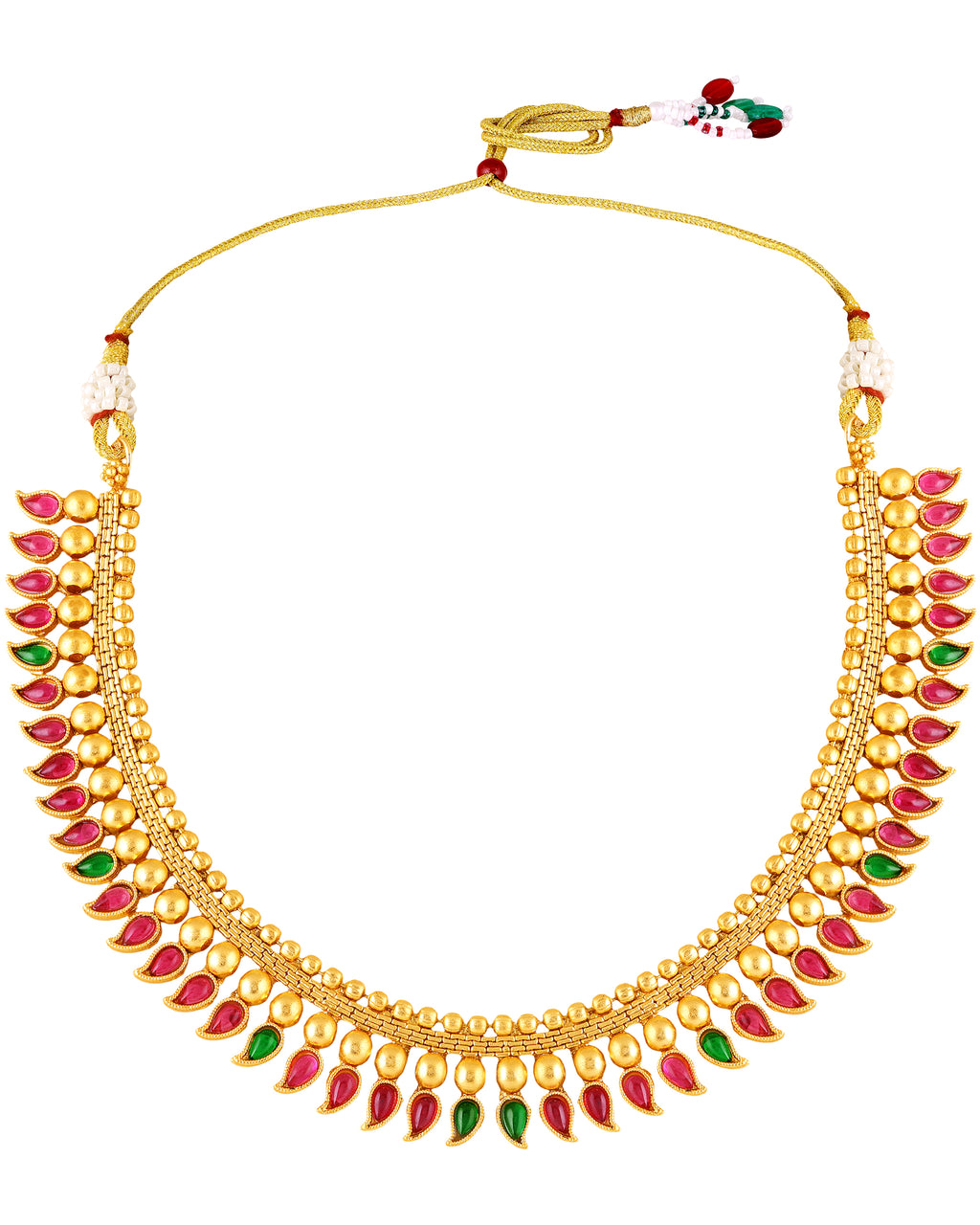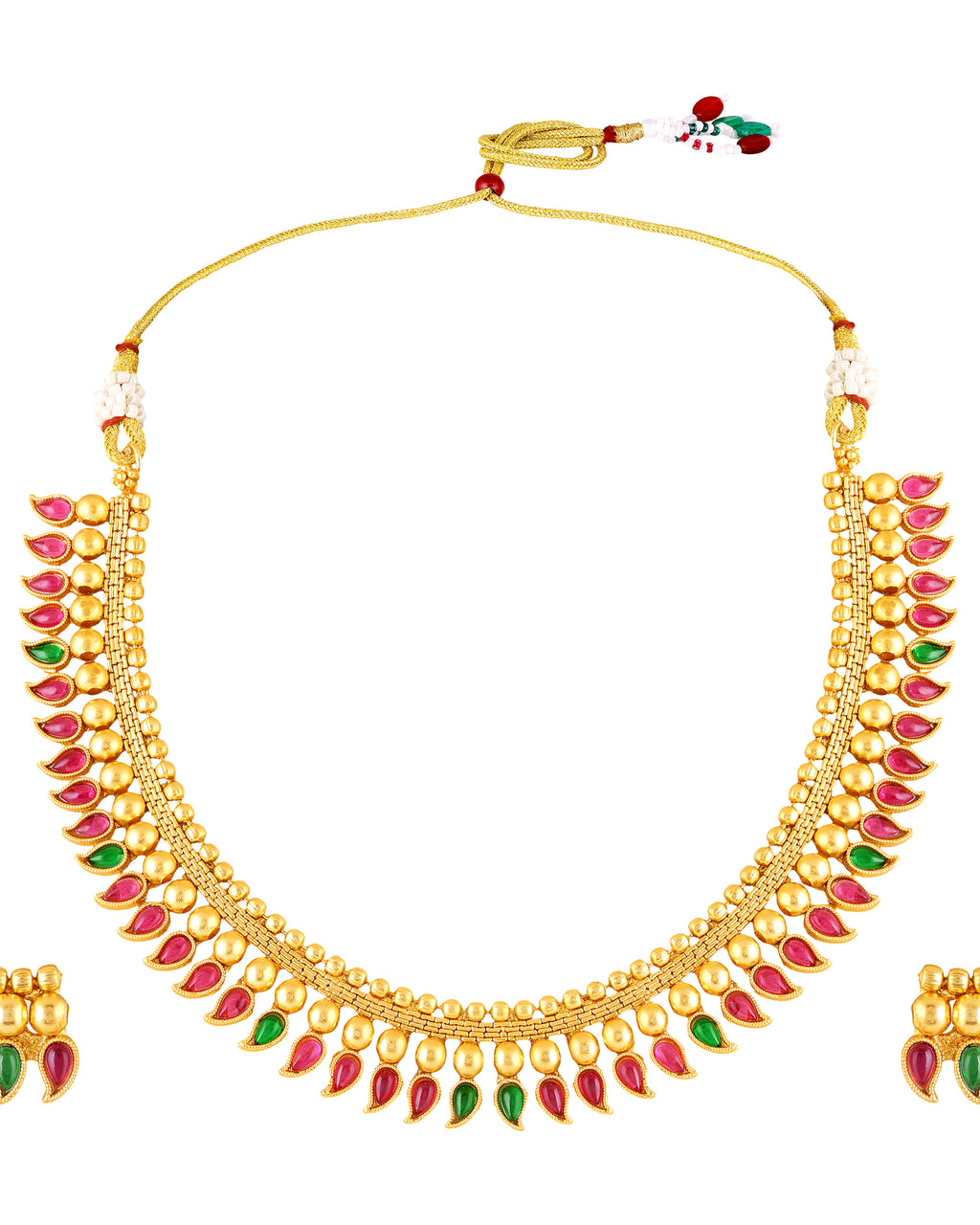 Bring home the charm of timeless tradition with this South Indian inspired gold plated necklace set. Designed with intricate craftsmanship, this set features a stunning necklace adorned with red and green enamel paisley motifs and a row of elegant golden beads.