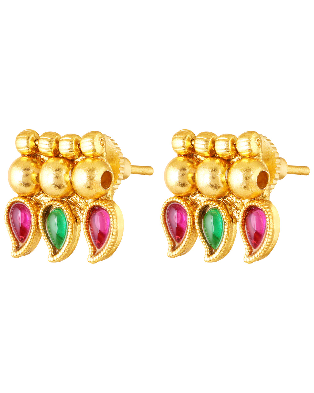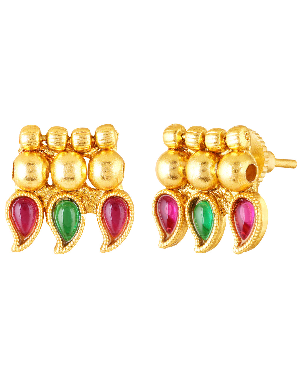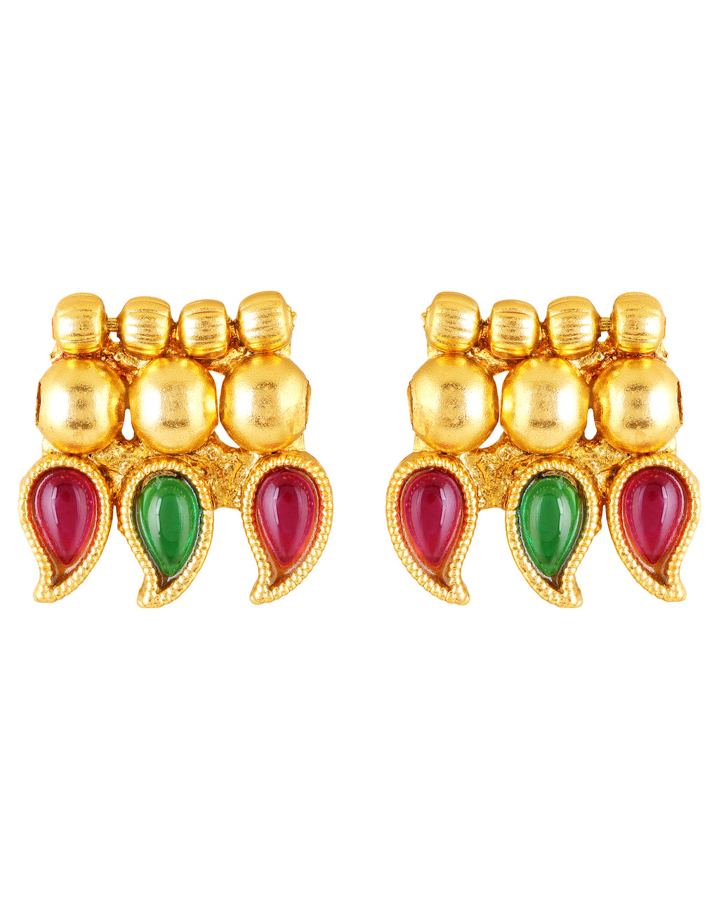 Bring home the charm of timeless tradition with this South Indian inspired gold plated necklace set. Designed with intricate craftsmanship, this set features a stunning necklace adorned with red and green enamel paisley motifs and a row of elegant golden beads.