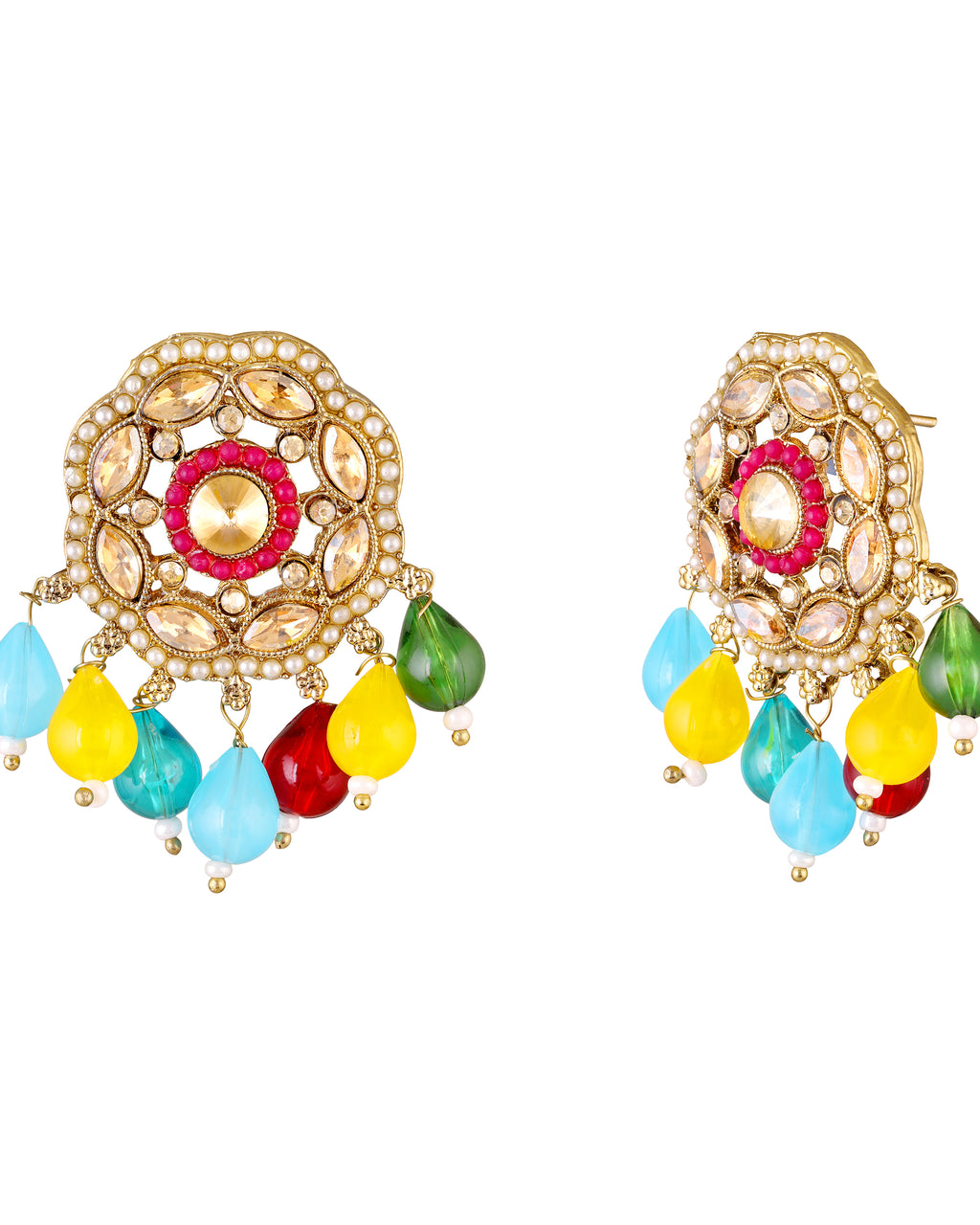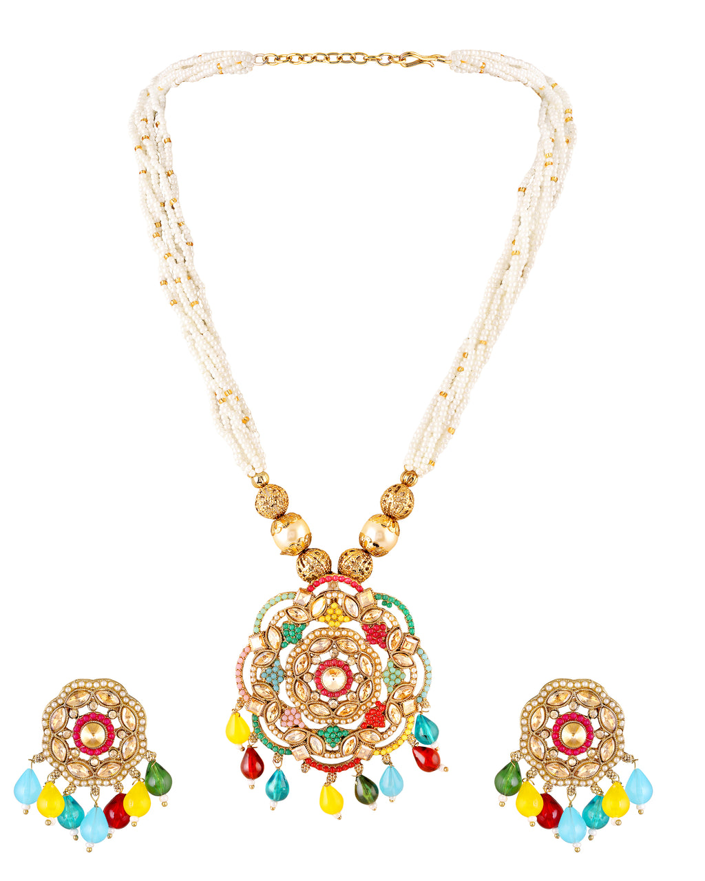 Elevate your ethnic look with this stunning traditional kundan necklace set featuring a grand multicolor floral pendant and matching earrings. Designed with intricate kundan work, pearl-beaded strings, and colorful hanging beads, this jewellery set is perfect for weddings, festivals, and special occasions.