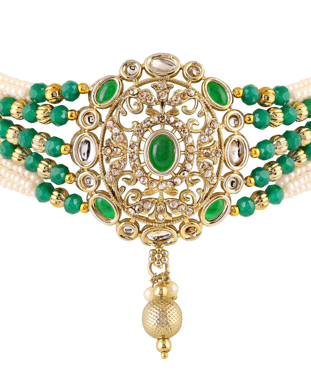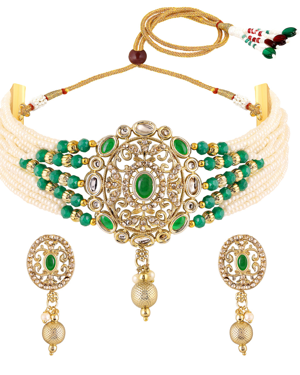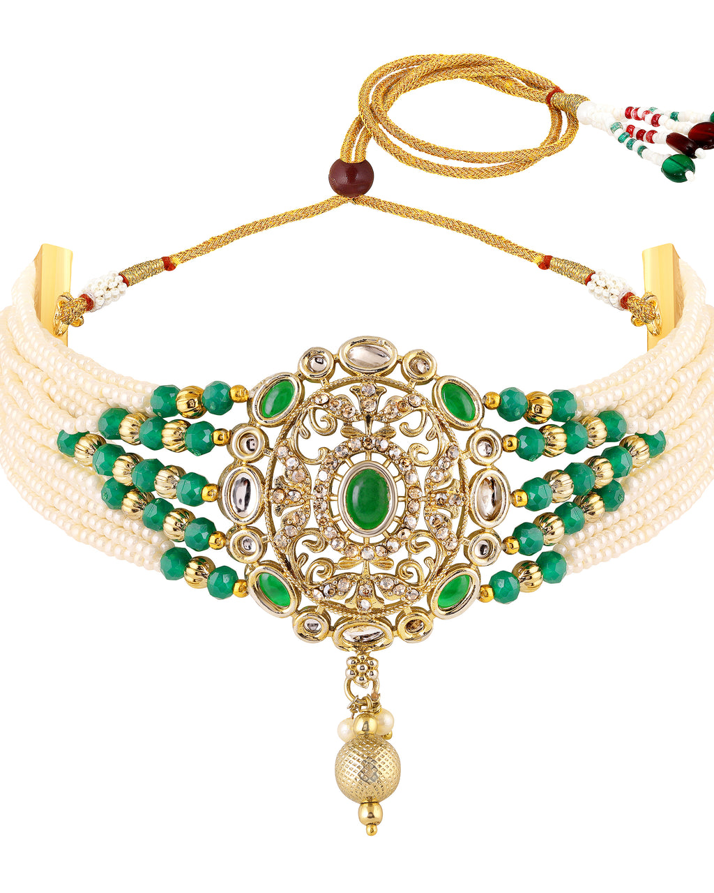 - Elegant Design: Traditional choker necklace with intricate kundan work, green stones, and Artificial pearl strings.