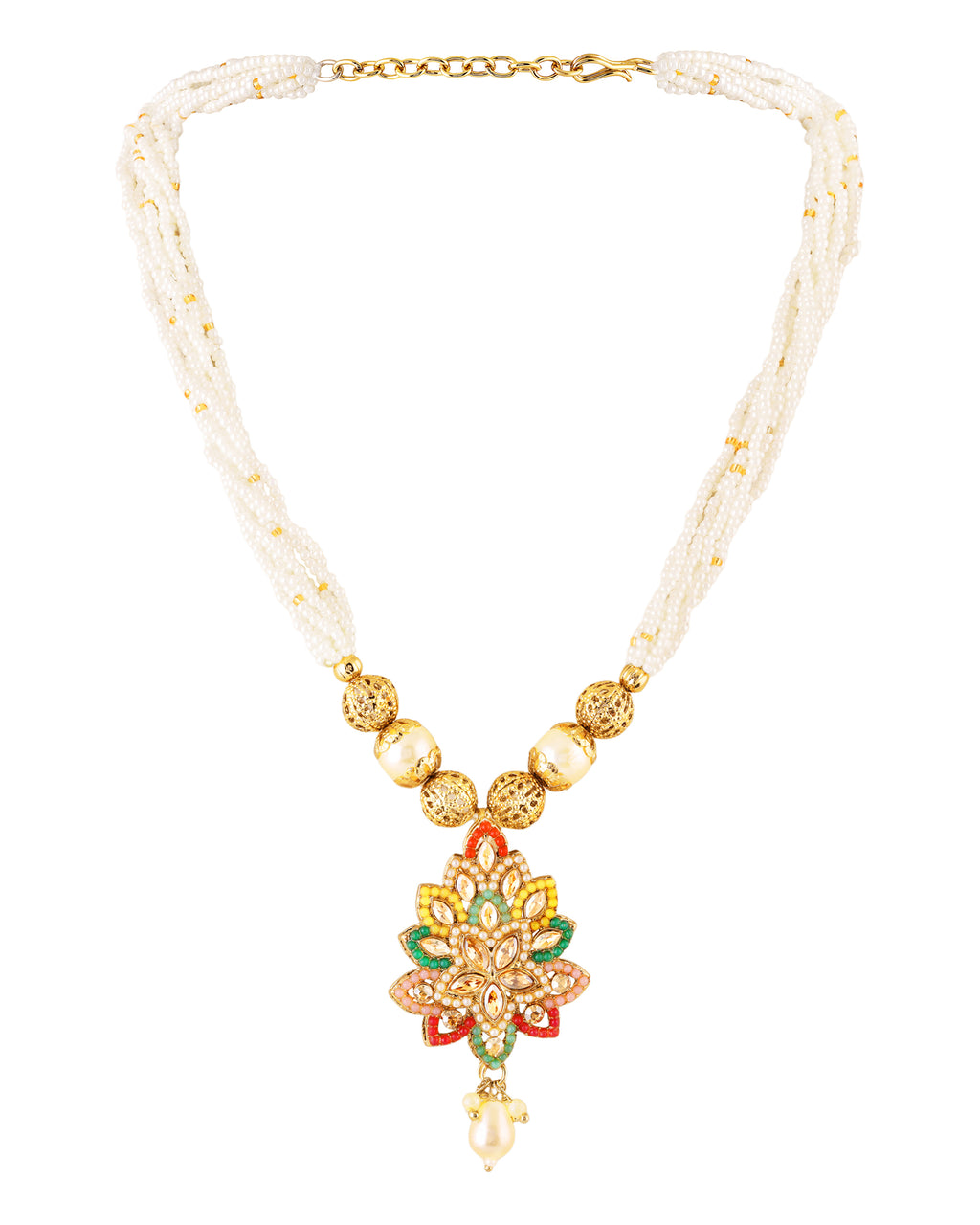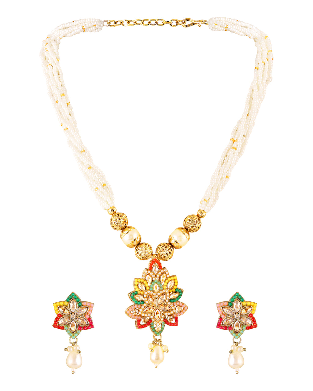 Elevate your traditional look with this exquisite multicolor kundan and pearl necklace set. Designed with intricate craftsmanship, this jewellery set features a beautifully carved pendant adorned with kundan stones in red, green, yellow, and peach hues, complemented by delicate pearl beads.