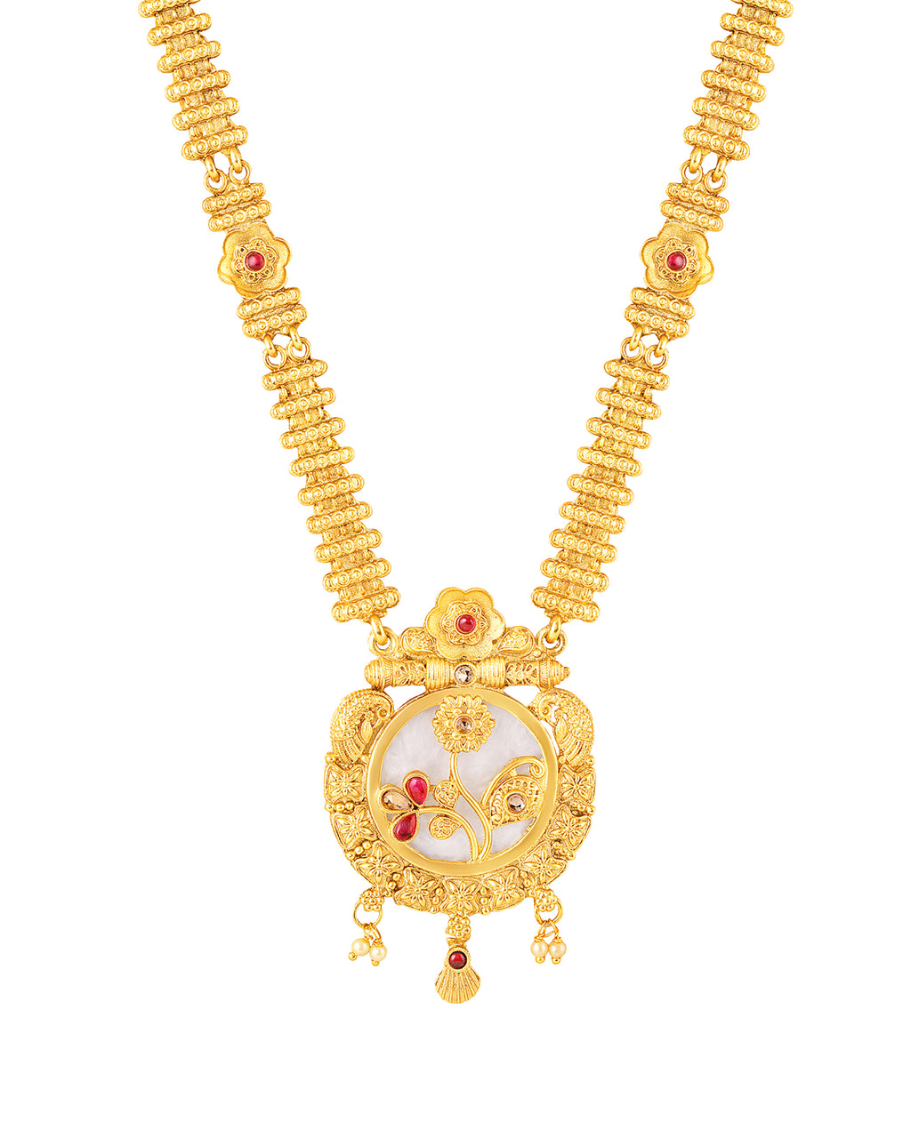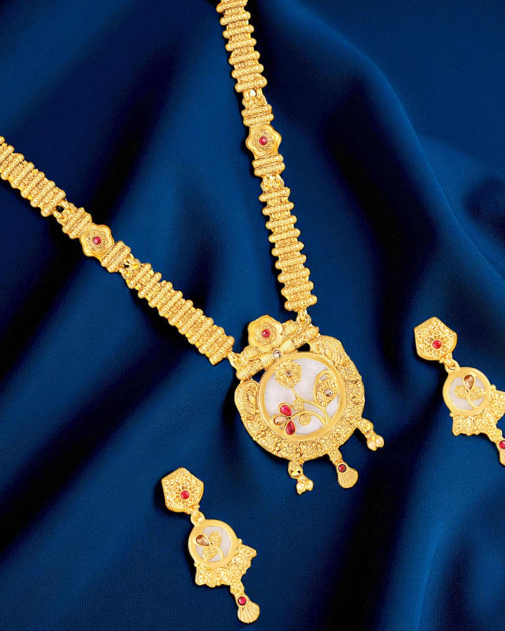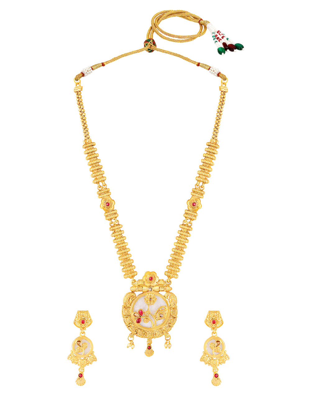 Elevate your traditional look with this stunning Gold-Plated Necklace Set, crafted with fine detailing and timeless ethnic patterns. The long necklace features beautifully arranged gold-toned links with a grand pendant at the center, adorned with floral designs and red stone embellishments.