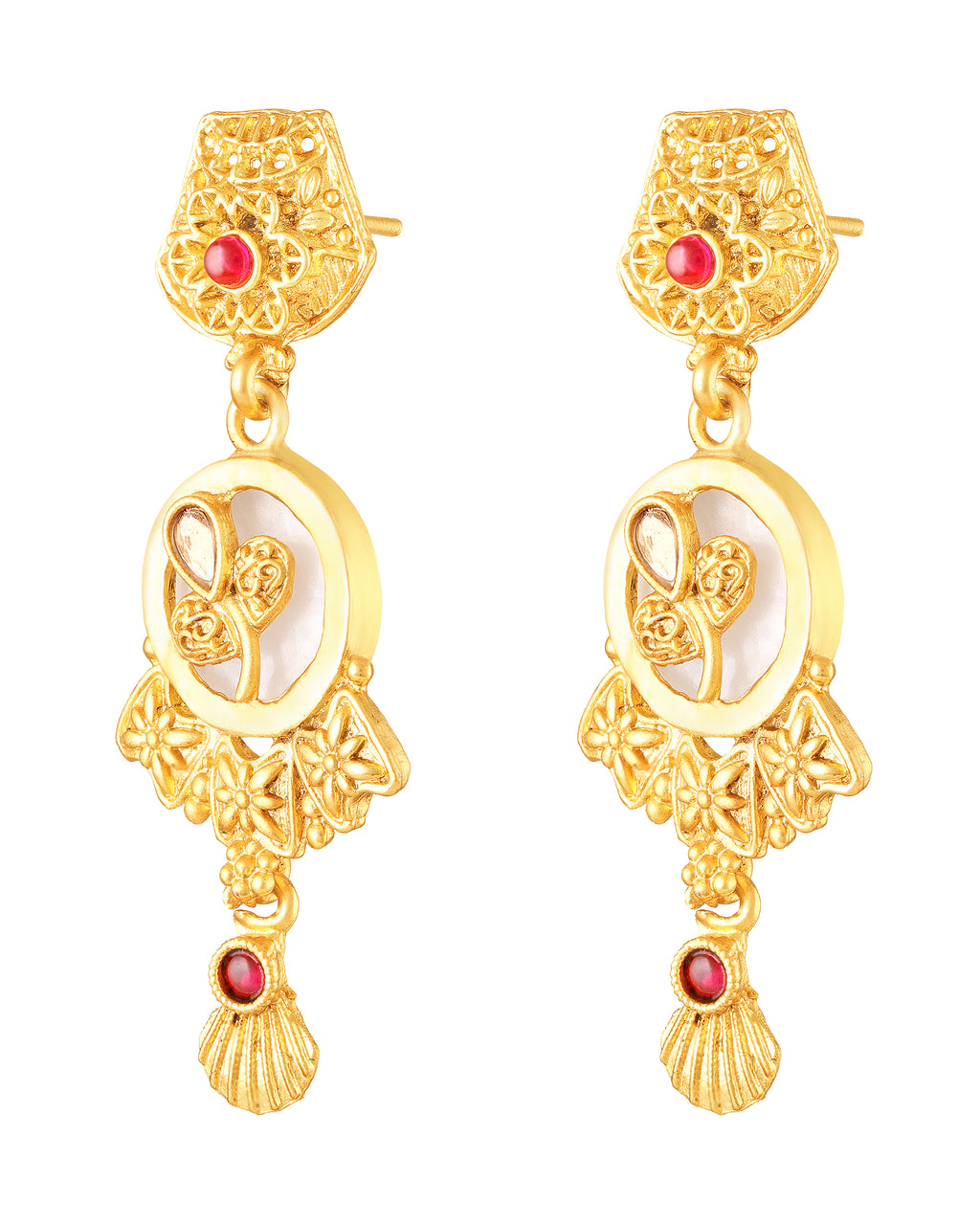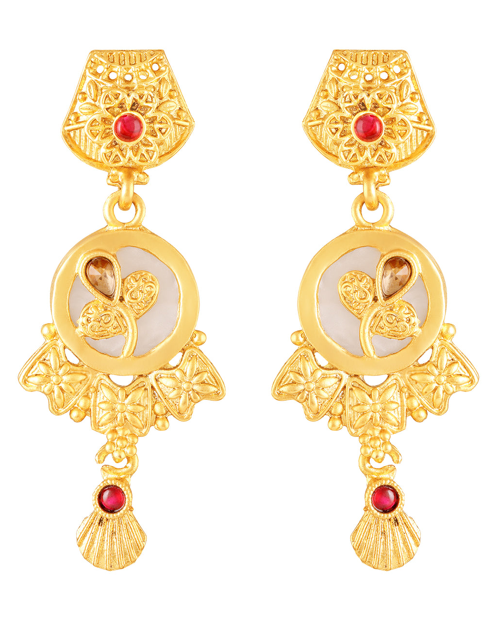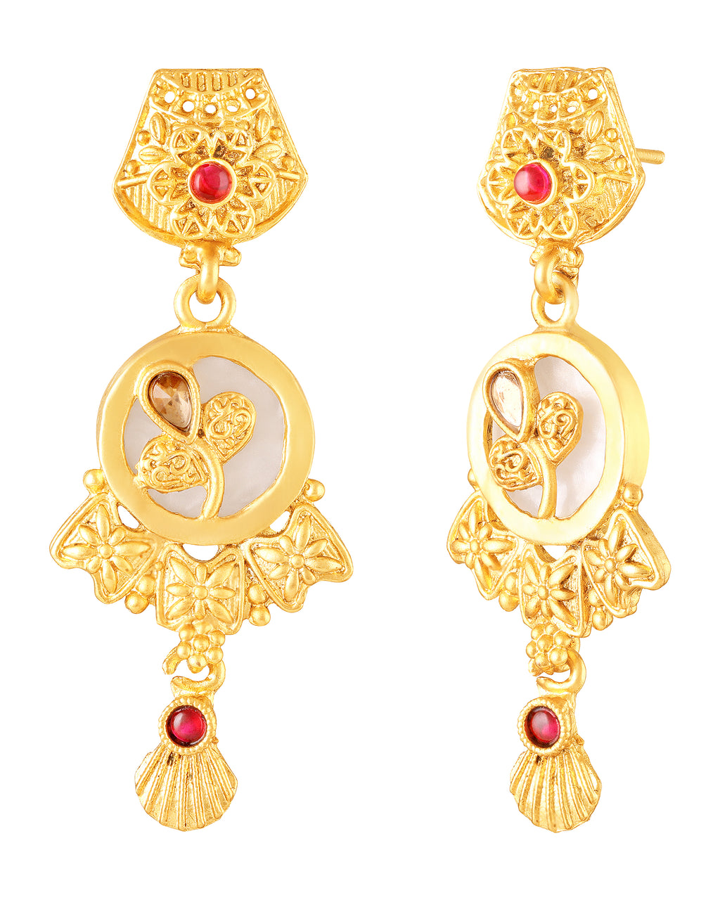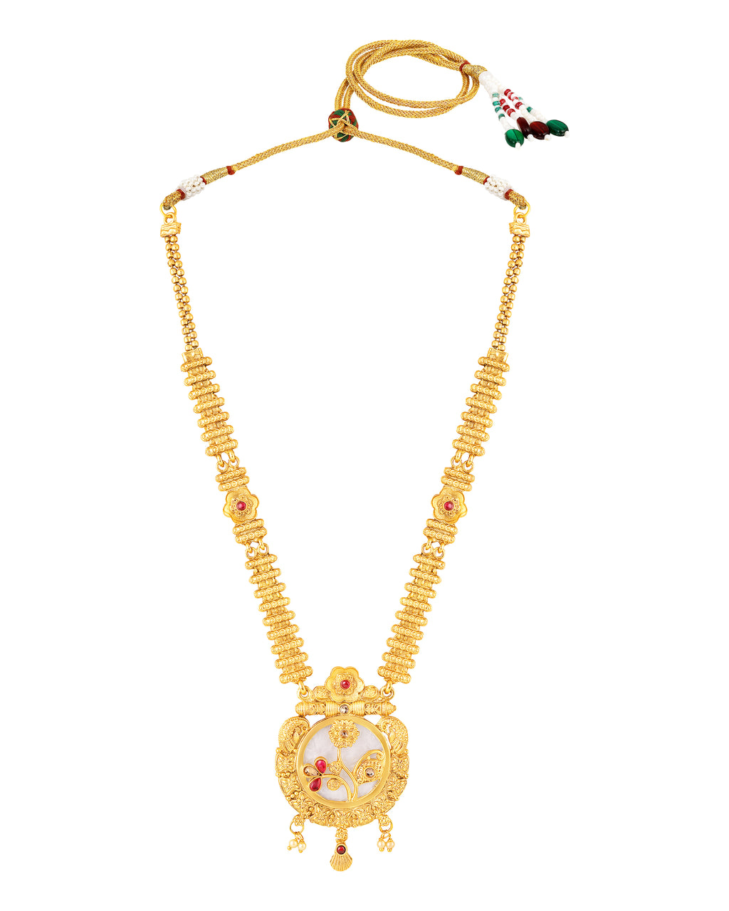 Elevate your traditional look with this stunning Gold-Plated Necklace Set, crafted with fine detailing and timeless ethnic patterns. The long necklace features beautifully arranged gold-toned links with a grand pendant at the center, adorned with floral designs and red stone embellishments.