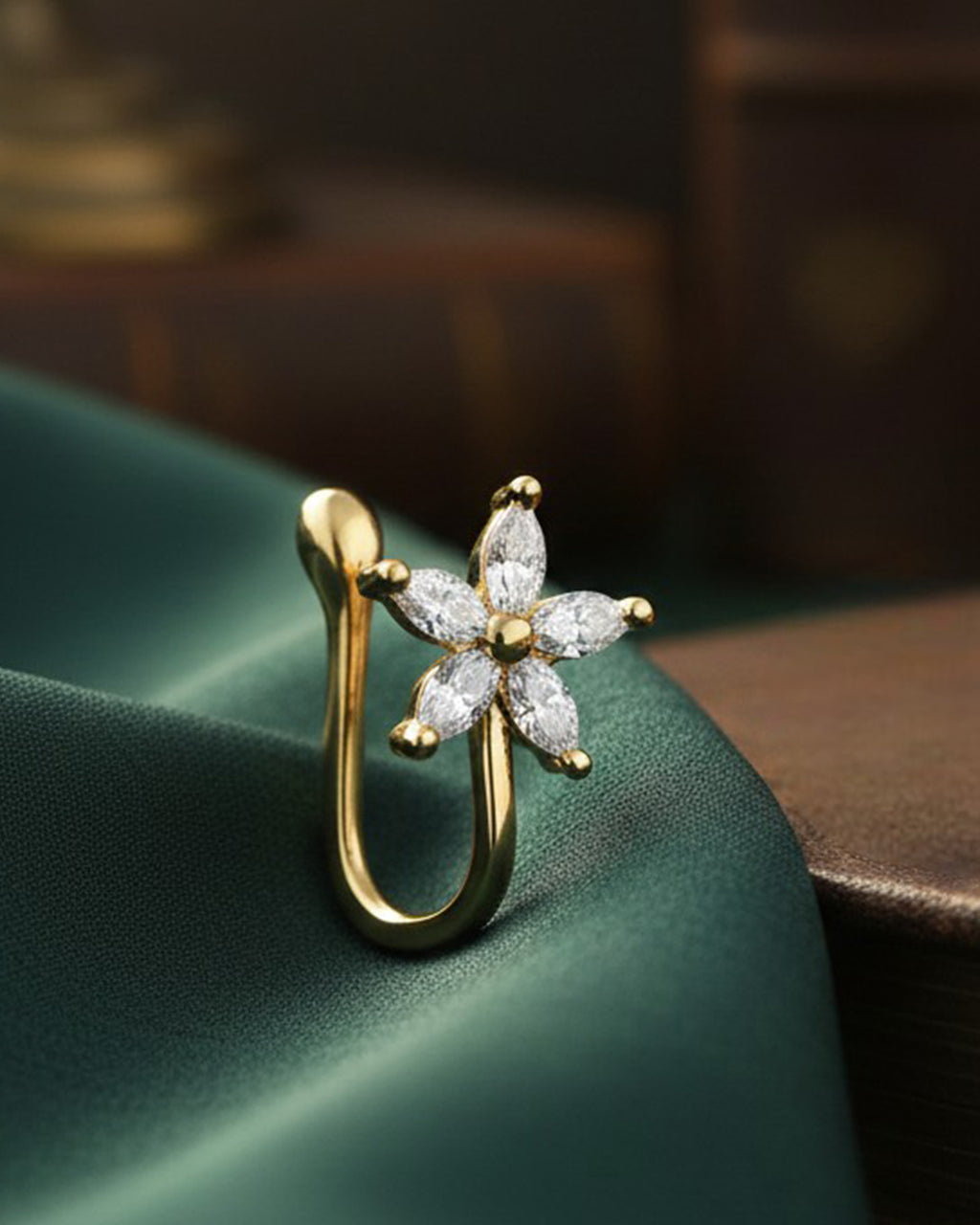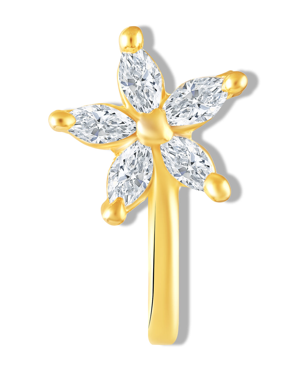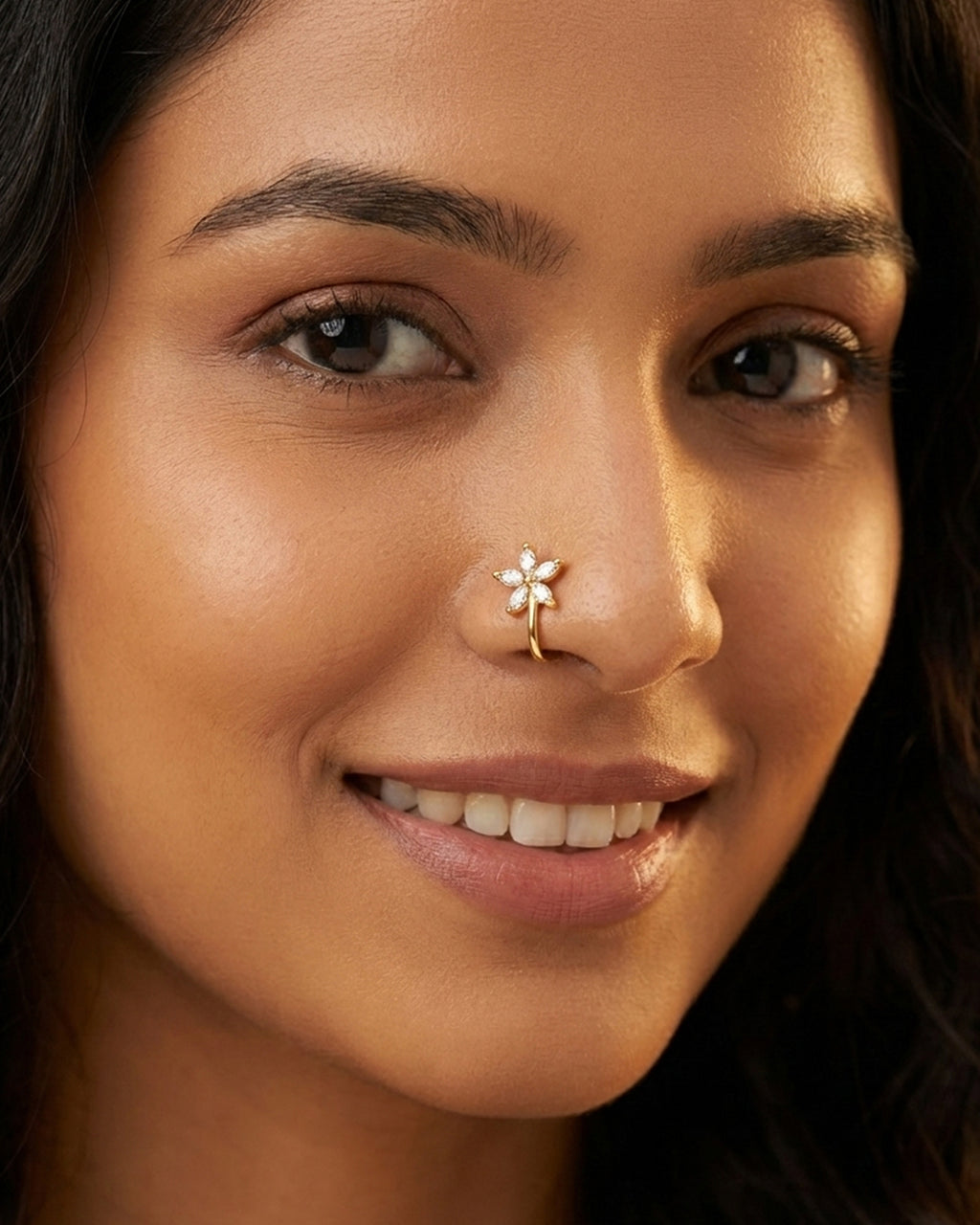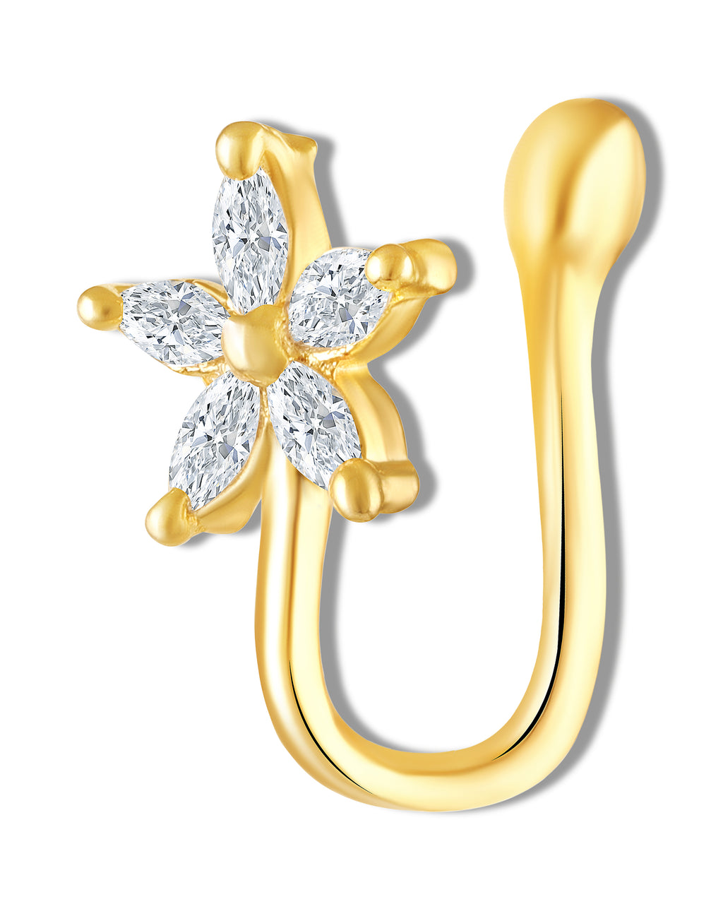 Add a fresh touch of sparkle to your look with the Mahi Floral crystals Nose Ring. Designed with a delicate 5-petal flower motif set with shimmering marquise-cut stones, this elegant gold-plated nose pin gives a graceful, festive shine while staying lightweight and comfortable for daily wear. A perfect pick for traditional outfits, parties, weddings, and gifting.