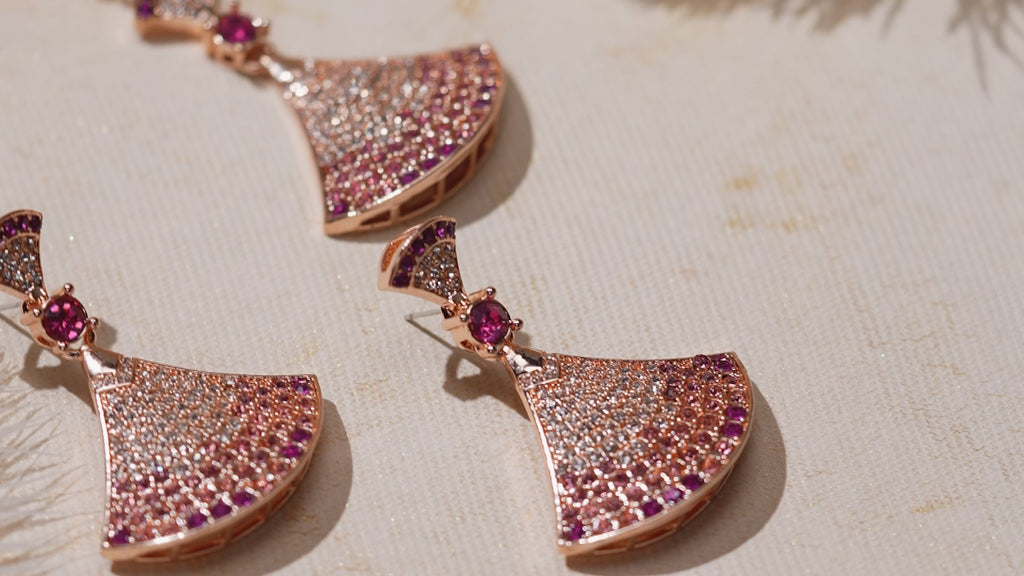 Exquisite Design: Fan-shaped pendant and earrings with layered crystal detailing create a visually striking and unique appeal.